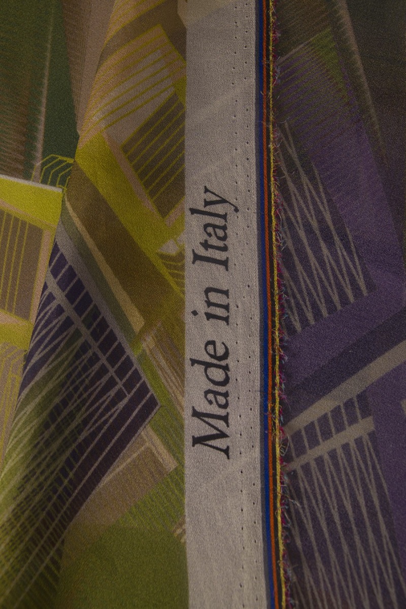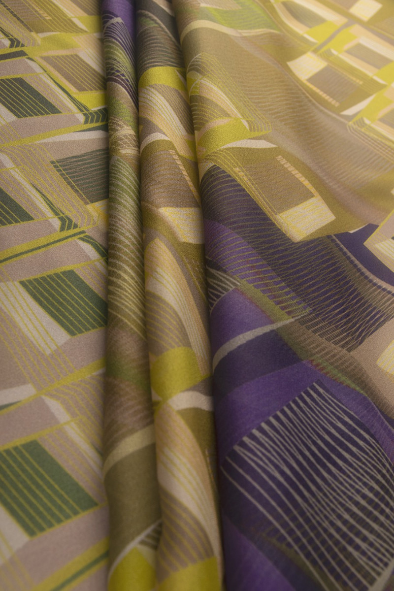 Żorżeta jedwabna o geometrycznym wzorze w kolorystyce zielono-beżowo-fioletowej. Tkanina transparentna (wymaga podszewki).