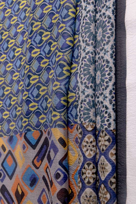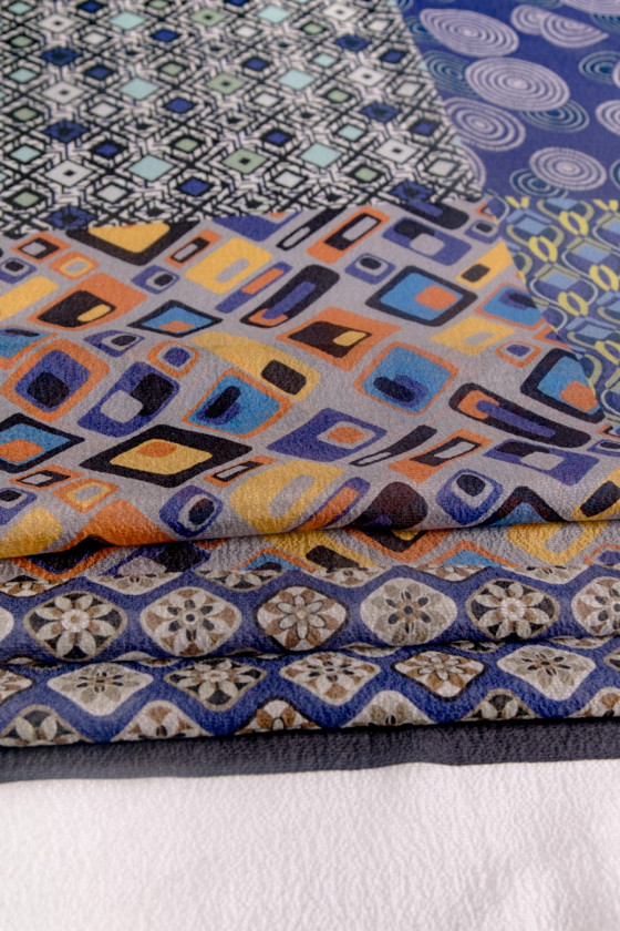Oryginalny szyfon jedwabny, lekko karbowany w kolorowy wzór patchworku. Tkanina występuje w kuponach 140*140 cm w kolorach niebieskim, fiolecie, odcieniach pomarańczu.