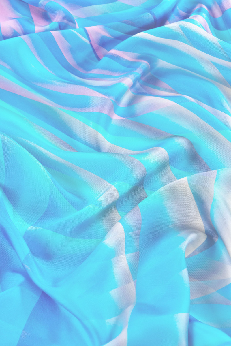 Włoska tkanina 100% jedwabna typu twill w kolorowe fale. Twill jedwabny to tkanina o splocie skośnym (diagonalnym), miękka, bardzo wytrzymała, delikatnie sztywno się układa.