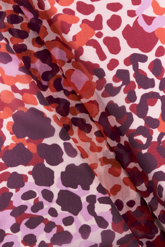Włoski szyfon 100% jedwabny w kolorze jasnej szarości z motywem czerwono-fioletowej panterki z pomarańczowymi akcentami. Tkanina cienka, transparentna, matowa, lekka i zwiewna.