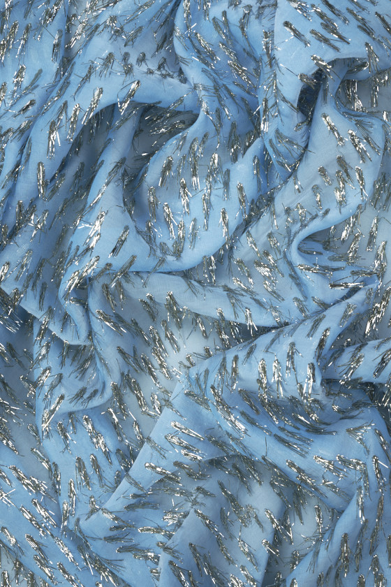 Włoski szyfon jedwabno-wiskozowy w kolorze błękitnym z motywem złotych frędzelków o długości 2 cm, wykonanych z nitki lureksowej. Szyfon to tkanina cienka, transparentna, matowa, lekka i zwiewna.