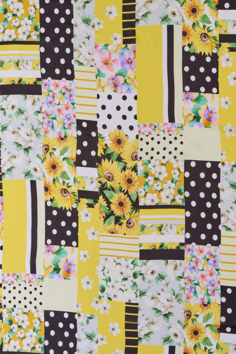 Włoski szyfon kreszowany 100% jedwabny z motywem kwiatowym ułożonym w formie patchworku w dominującym żółtym kolorze i kontrastującym z nim czarnym. Interesujące połączenie wyraźnych słoneczników z delikatnymi bratkami i różami oraz kropkami i kreseczkami tworzy oryginalny wzór materiału. Tkanina jest lekka, zwiewna, delikatnie transparentna, elastyczna - pracuje na nitkach. Piękna propozycja do stworzenia wyjątkowej sukienki, bluzki lub apaszki.