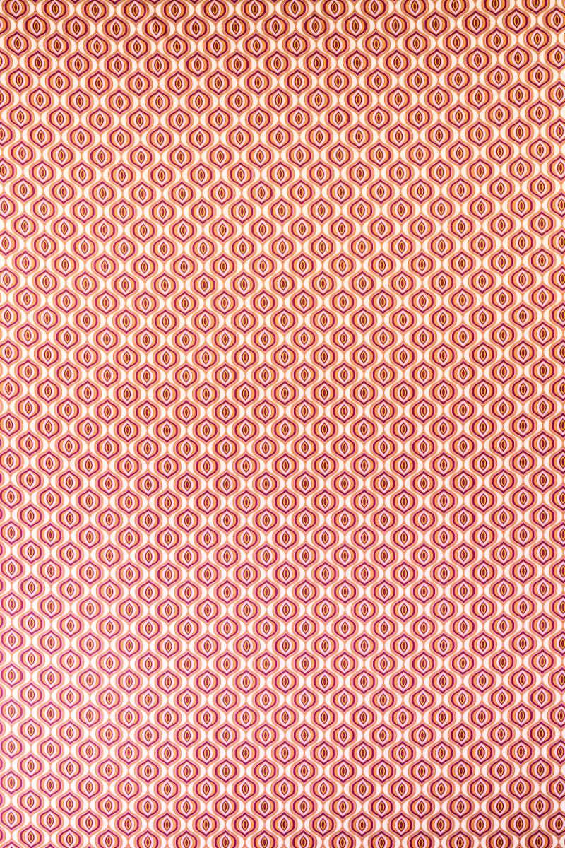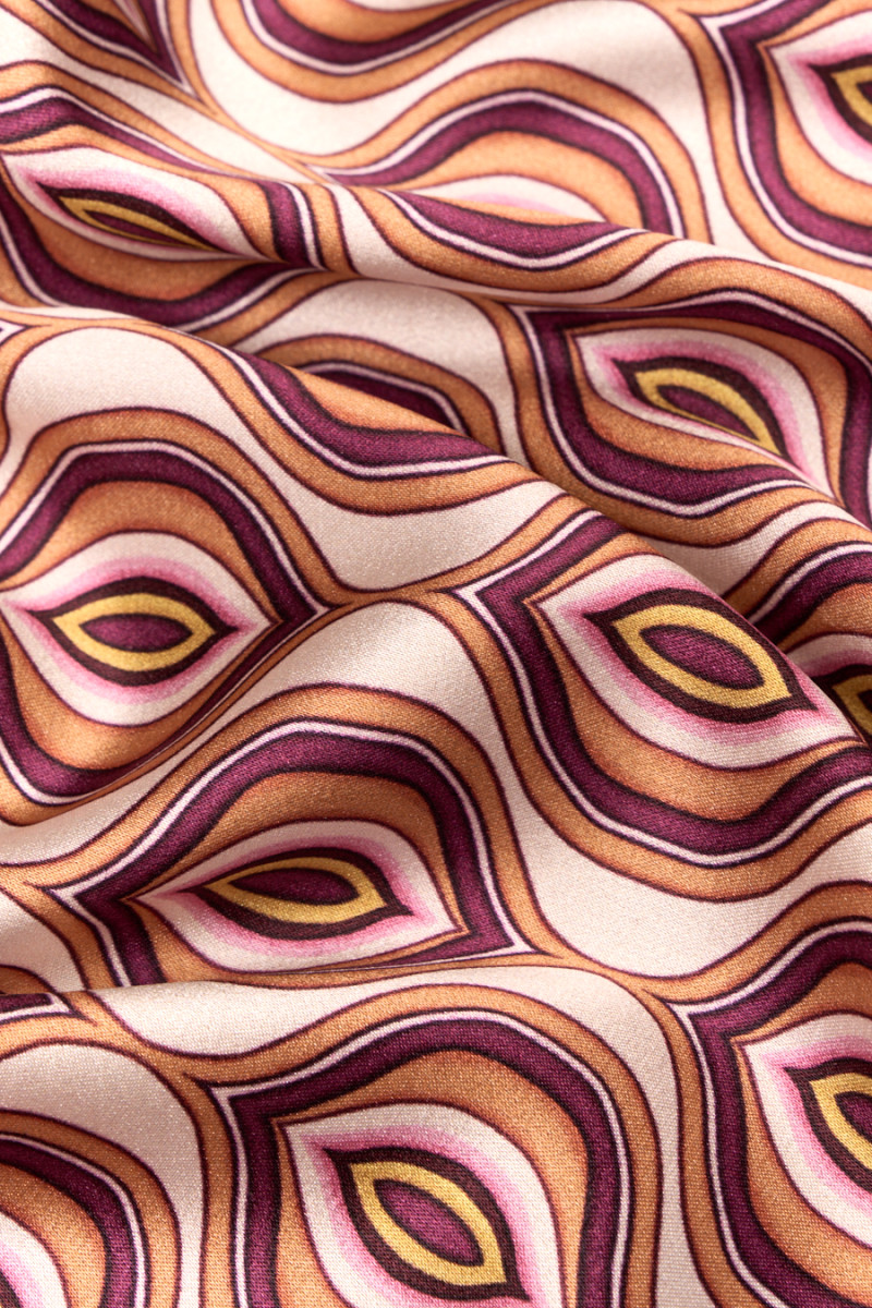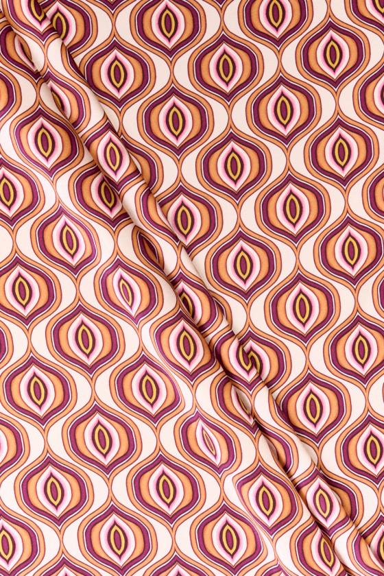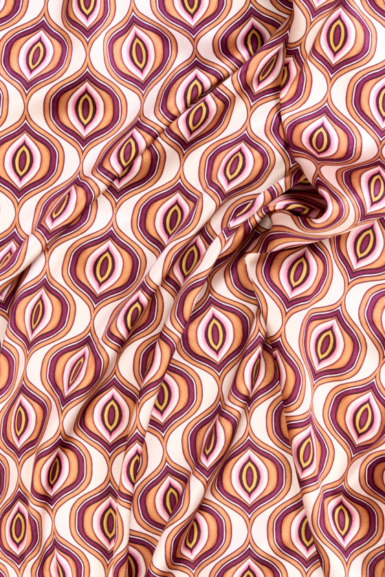 Włoska satyna jedwabna z dodatkiem elastanu z regularnym wzorem pawich oczek na beżowym tle. Gęsto ułożone motywy o wielkości 5 cm * 5 cm w rudych, bordowych i różowych kolorach. Satyna jedwabna jest gęstą i lekką tkaniną o płaskiej powierzchni, dodatek elastanu sprawia, że jest wygodniejsza w noszeniu i się mniej gniecie. Idealnie sprawdzi się do uszycia pięknej koszuli, spódnicy oraz luźniejszych spodni.