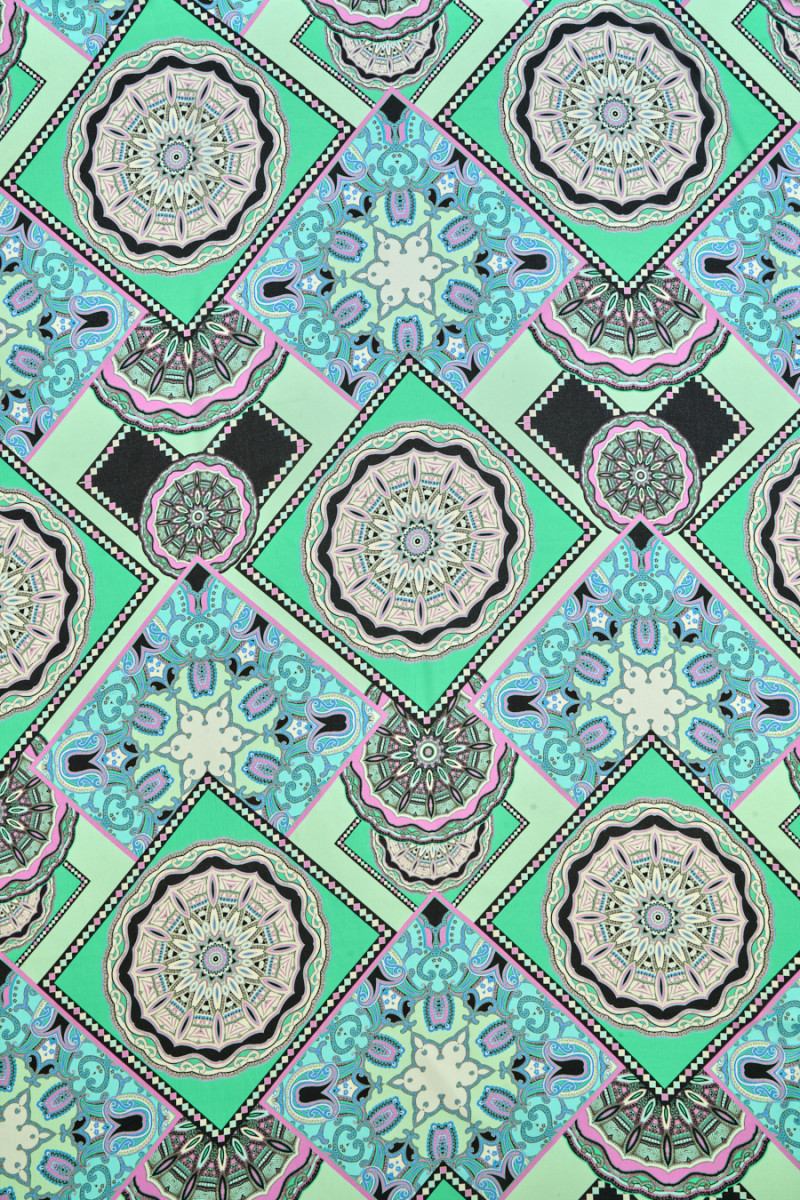 Włoska tkanina utkana w 100% z jedwabiu naturalnego w orientalno-geometryczne motywy. Duże wzory w świeżych odcieniach zieleni, różu, niebieskiego, wyostrzone czarnymi elementami. Tkanina o delikatnym splocie żakardowym, jest lekko transparentna, lejąca, przyjemna w chwycie i nieelastyczna. Wspaniała propozycja na sukienki, spódnice, bluzki a także szale.