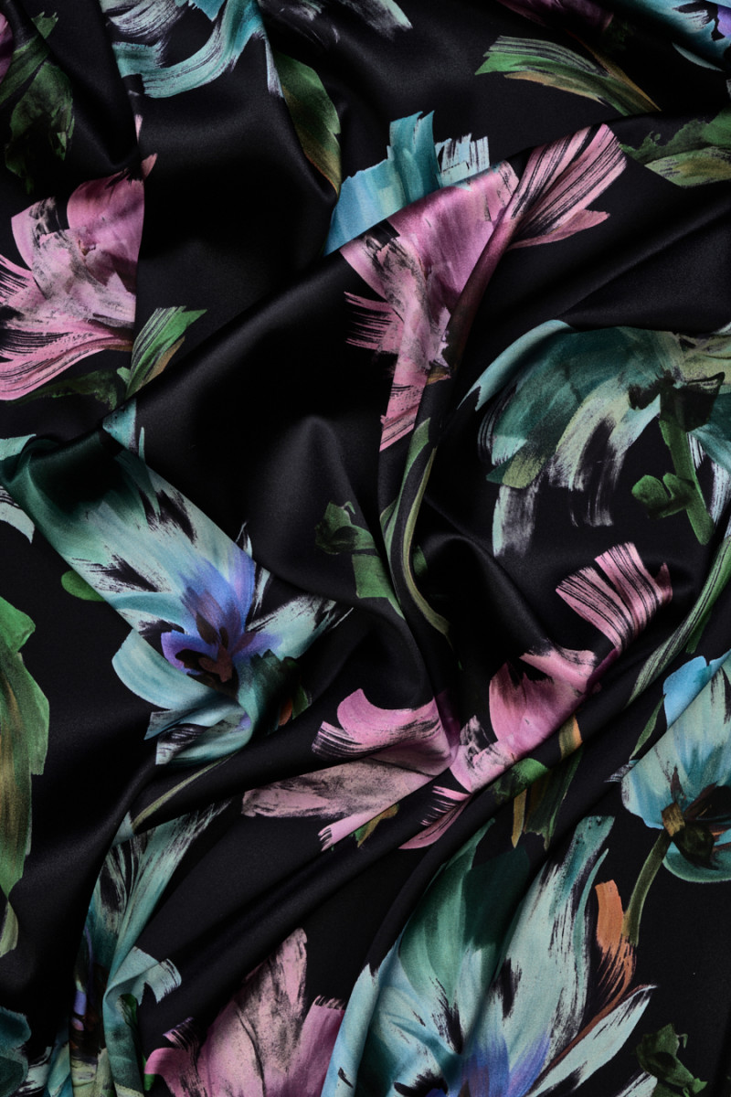Włoska satyna jedwabna z dodatkiem elastanu z motywem dużych, malowanych pędzlem kwiatów na bardzo ciemnym, granatowym tle. Gęsty wzór wykonany w odcieniach turkusu i wrzosowego różu, największy kwiat ma wymiar 23 cm * 27 cm. Tkanina jest lejąca, miękka, elastyczna i pięknie błyszcząca, co nadaje jej wyjątkowej elegancji. Doskonale sprawdzi się na zwiewne sukienki, spódnice, a także bluzki i koszule.