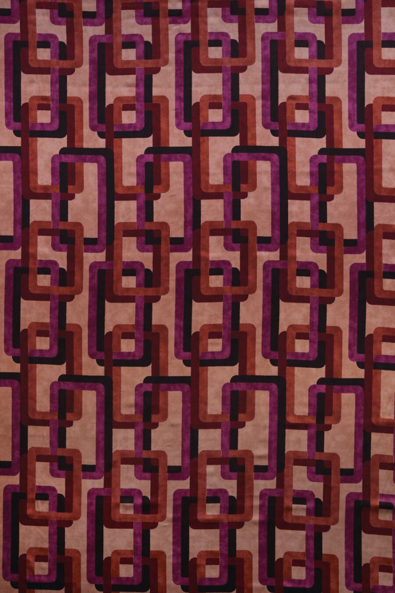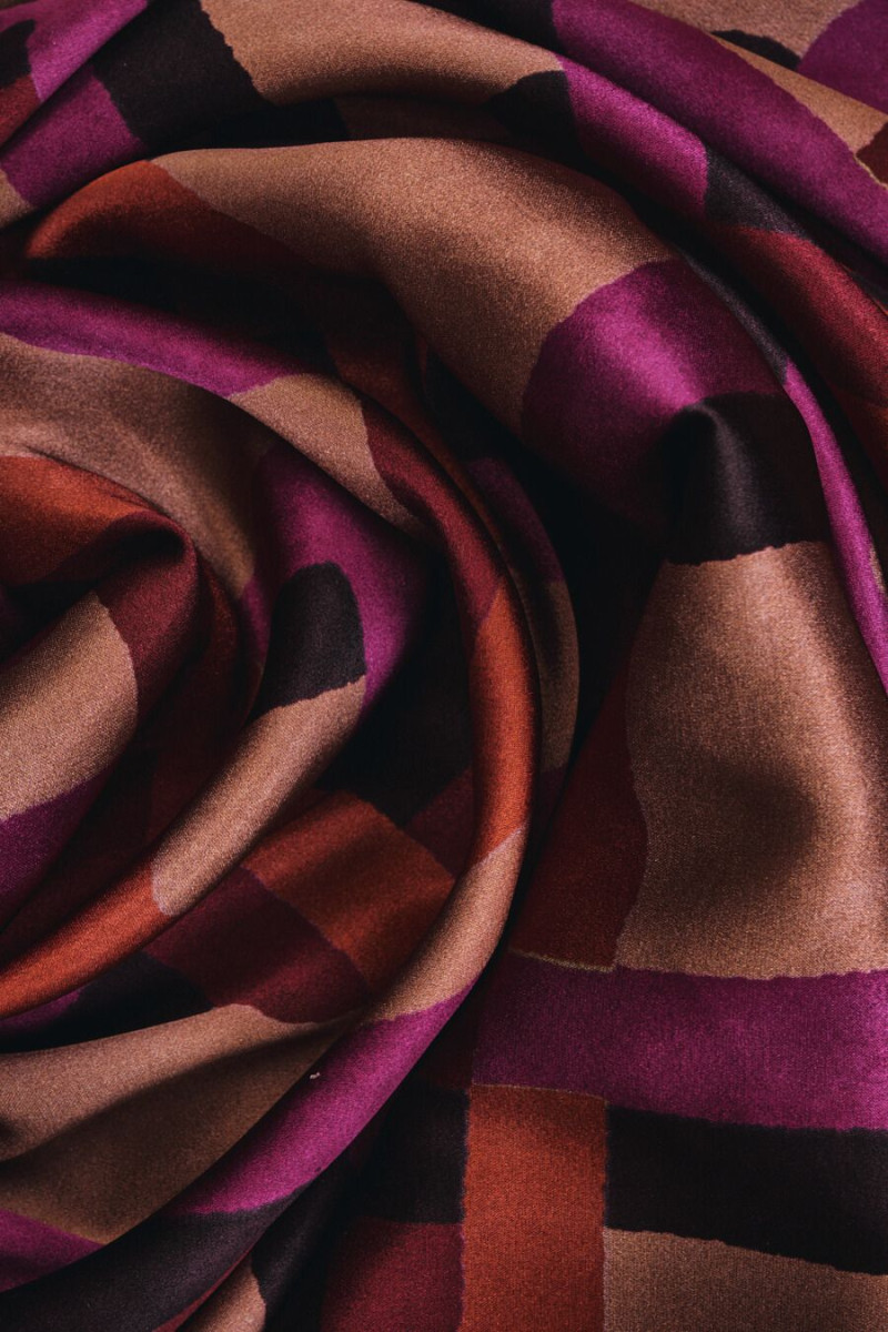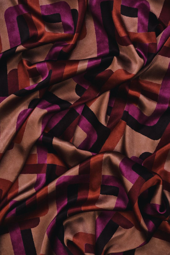 Włoska satyna jedwabna z dodatkiem elastanu z geometrycznymi motywami w kolorach fuksji, brązu oraz pomarańczowym na tle w kolorze cappuccino. Regularny wzór w formie prostokątów o zaokrąglonych brzegach, które nachodzą na siebie wykonany w pięknych jesiennych barwach. Tkanina jest lejąca, miękka, elastyczna i pięknie błyszcząca, co nadaje jej wyjątkowej elegancji. Fantastyczna propozycja, która sprawdzi się w uszyciu zwiewnych sukienek, spódnic, a także bluzek i koszul.
