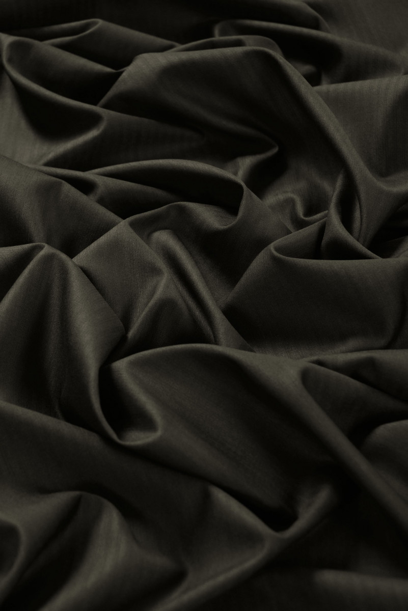 Włoska tkanina kostiumowa w paski w kolorze czarno-oliwkowym (dwuton) - mieszanka wełny naturalnej i jedwabiu naturalnego. Tkanina miękka, mięsista, nieelastyczna z charakterystycznym dla tkanin jedwabnych połyskiem - idealna na uszycie kostiumu, garnituru, spodni, spódnicy, sukienki.