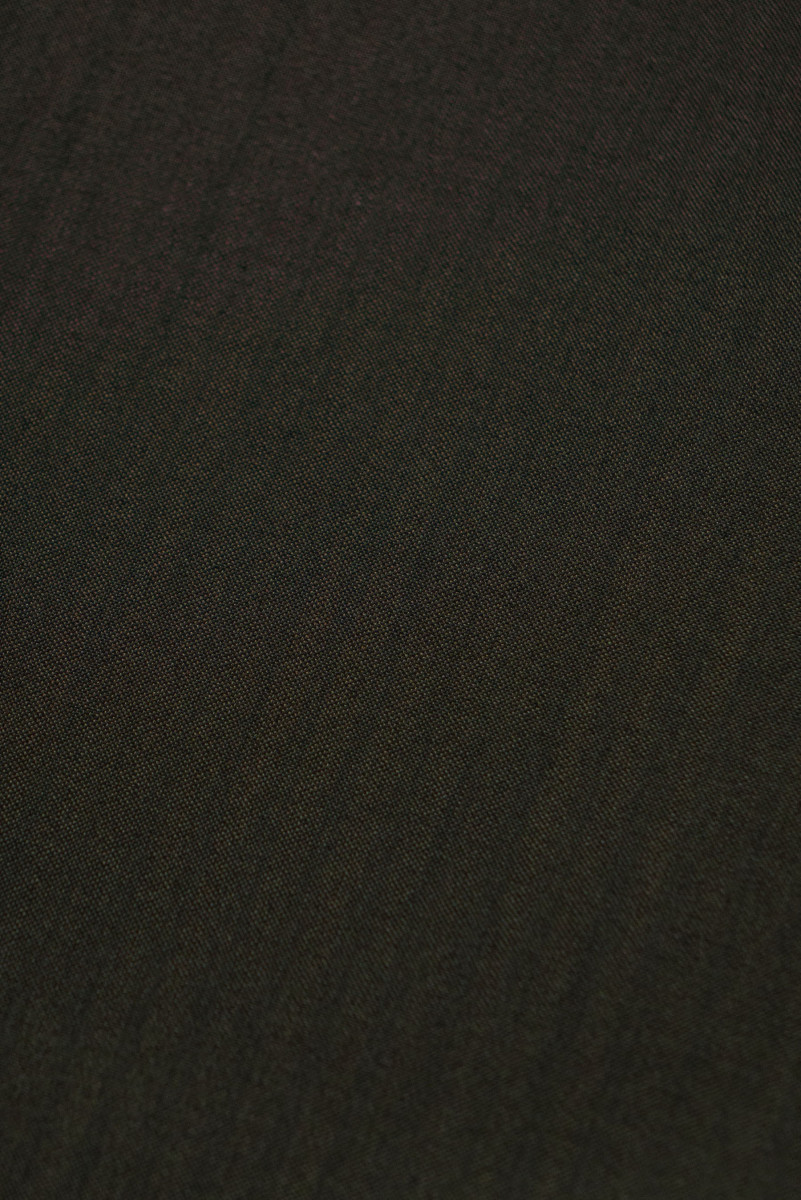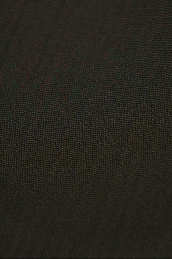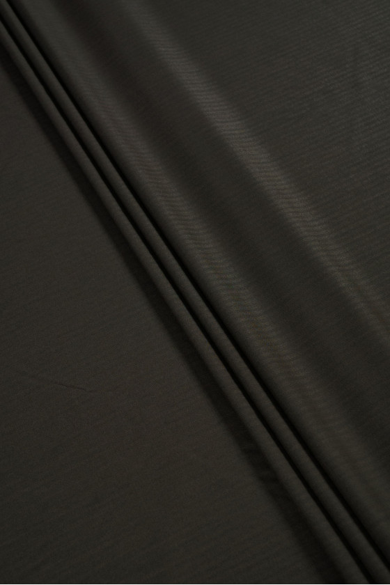 Włoska tkanina kostiumowa w paski w kolorze czarno-oliwkowym (dwuton) - mieszanka wełny naturalnej i jedwabiu naturalnego. Tkanina miękka, mięsista, nieelastyczna z charakterystycznym dla tkanin jedwabnych połyskiem.
