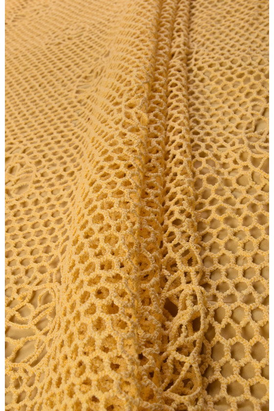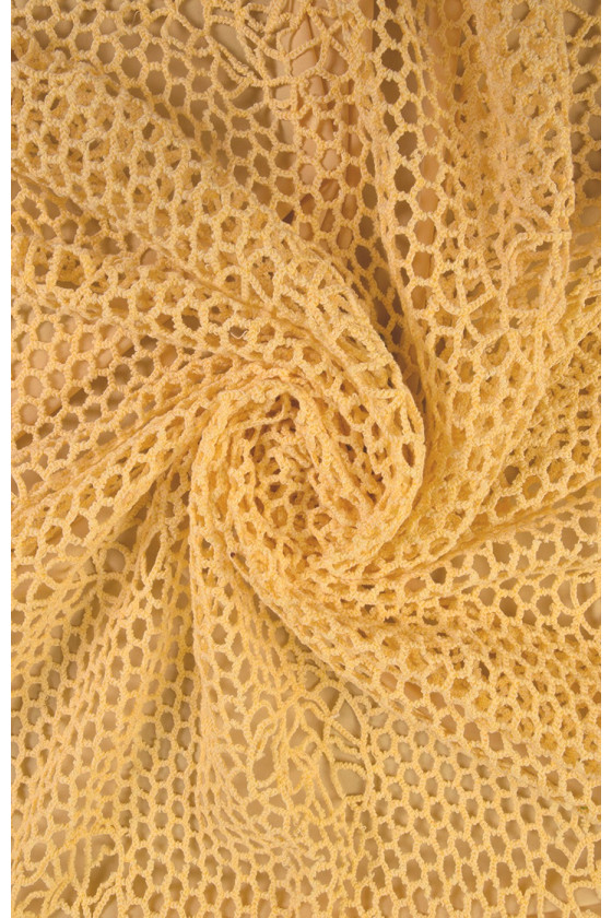 Koronka w kolorze jasno-żółtym o splocie siatki ze wzorem kwiatów. Polecamy do uszycia retro sukienek, bluzeczek lub chust i szali. Kupon o wymiarach 110cm* 125cm.