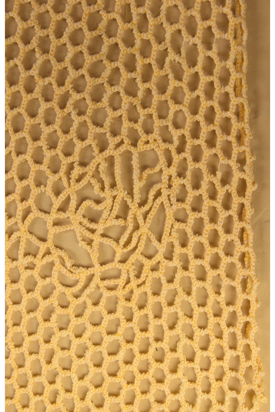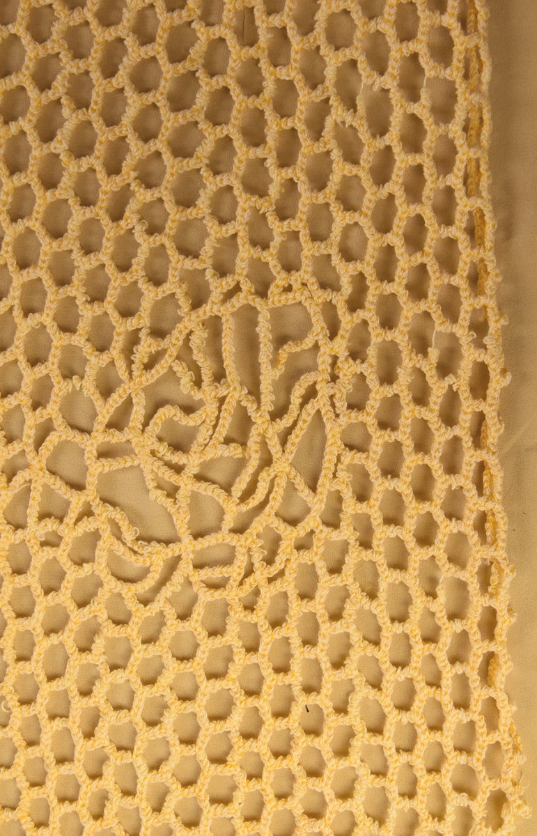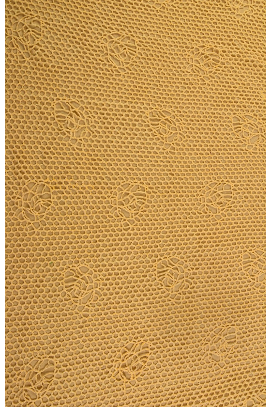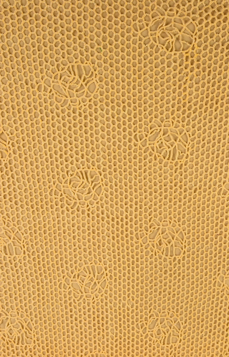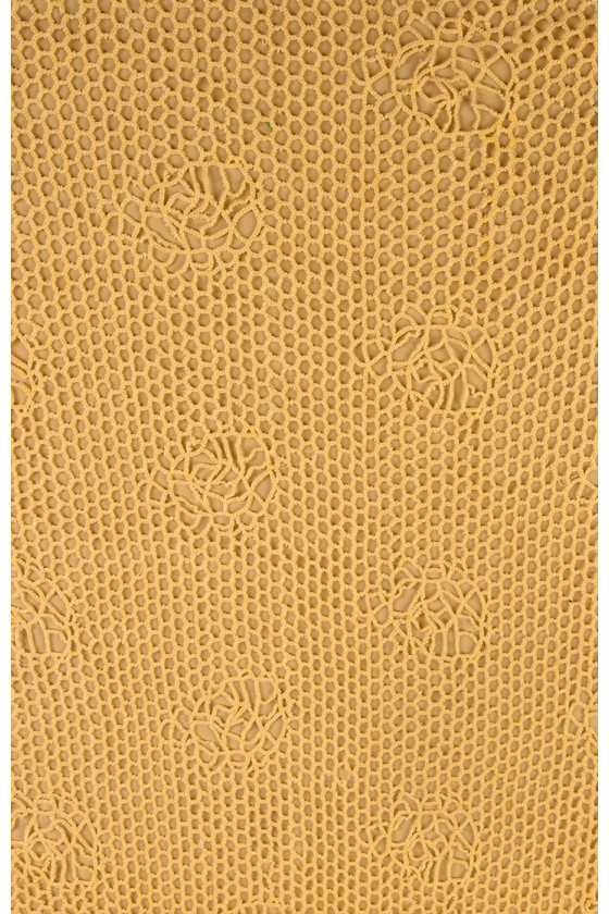 Koronka w kolorze jasno-żółtym o splocie siatki ze wzorem kwiatów. Polecamy do uszycia retro sukienek, bluzeczek lub chust i szali.