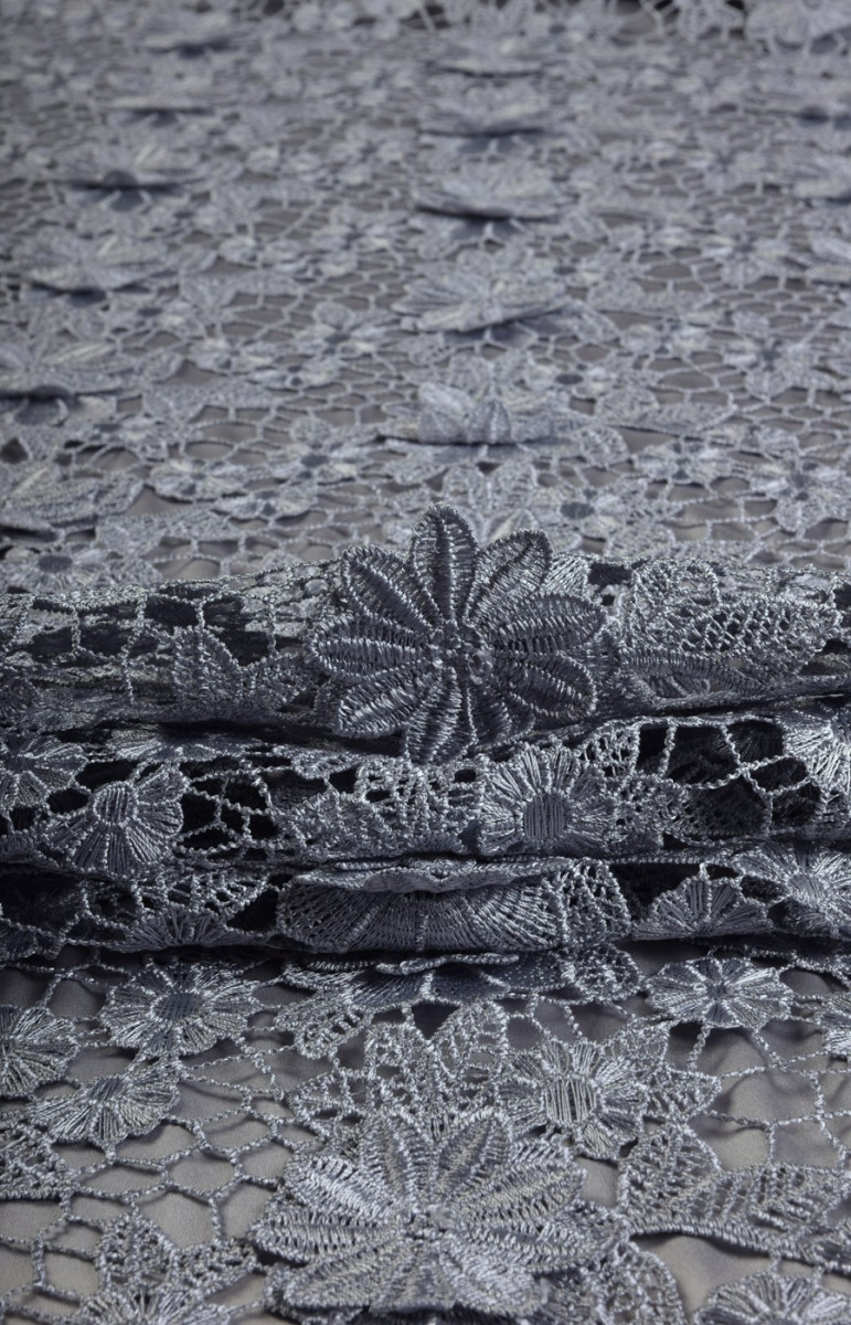 Koronka gipiurowa 3D w kolorze srebrzysto-szarym z naszytymi luźno kwiatkami , bardzo efektowna. Dla pięknego efektu polecamy dobrać do niej podszewkę np. z satyny.