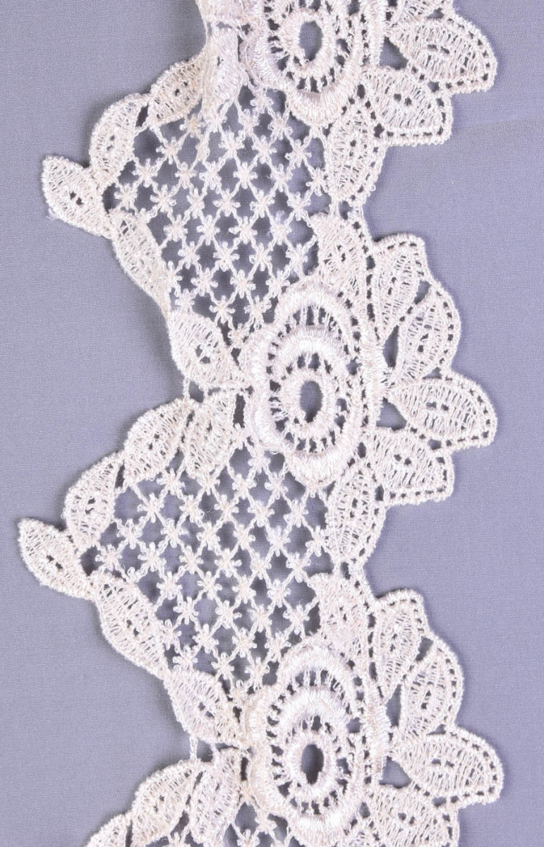Taśma z koronki gipiurowej w kolorze jasnego beżu szerokości ok 5 cm . Dodatek krawiecki.