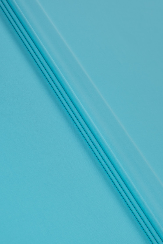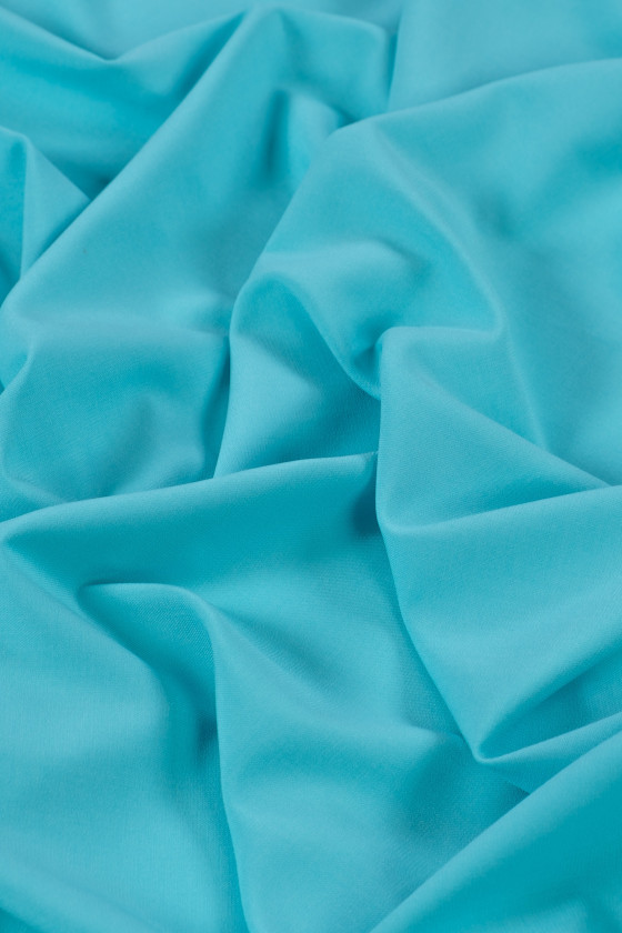Włoska tkanina sukienkowa typu cadi w kolorze jasnego turkusu. Tkanina sukienkowa typu cadi jest kryjąca, mięsista, spływająca (ciężka). Można uszyć z niej sukienki, bluzki, spódnice, cienkie marynarki.
