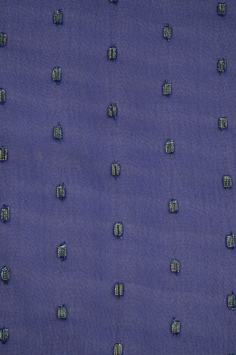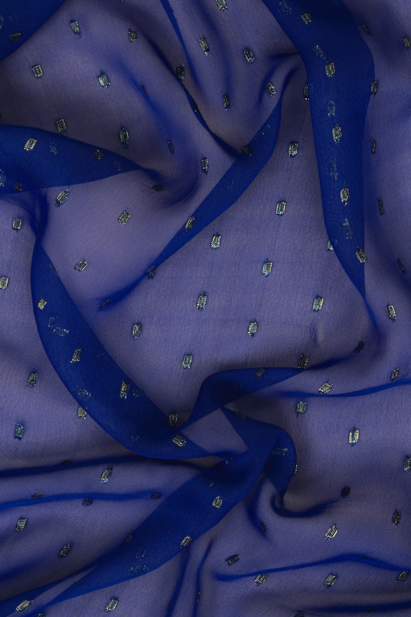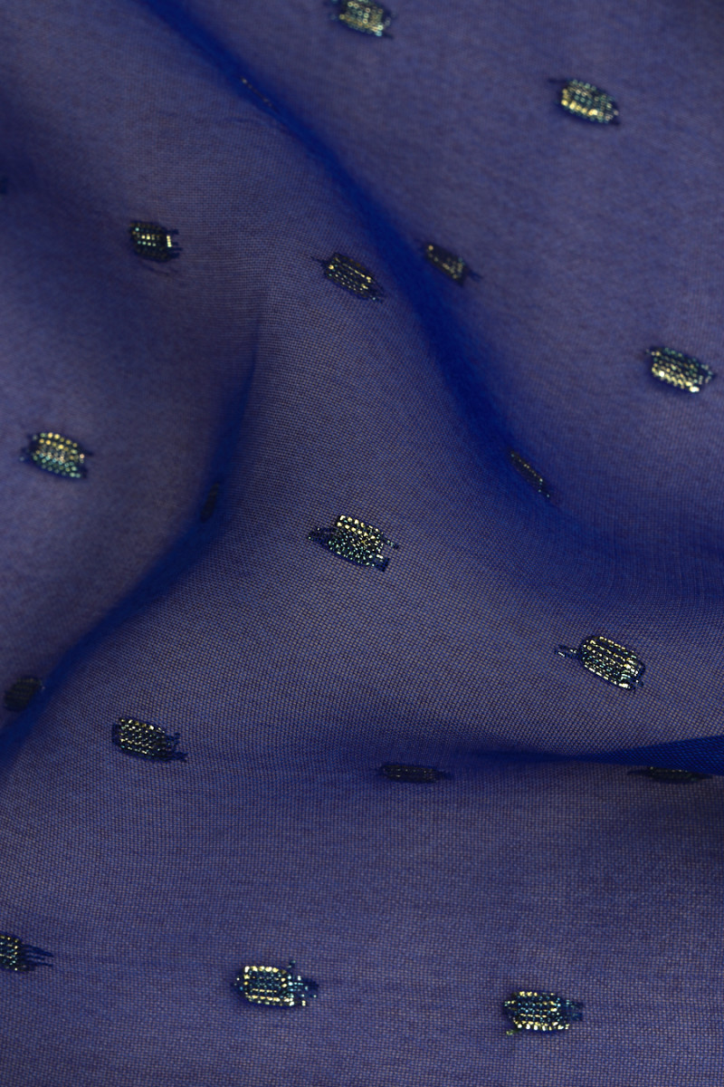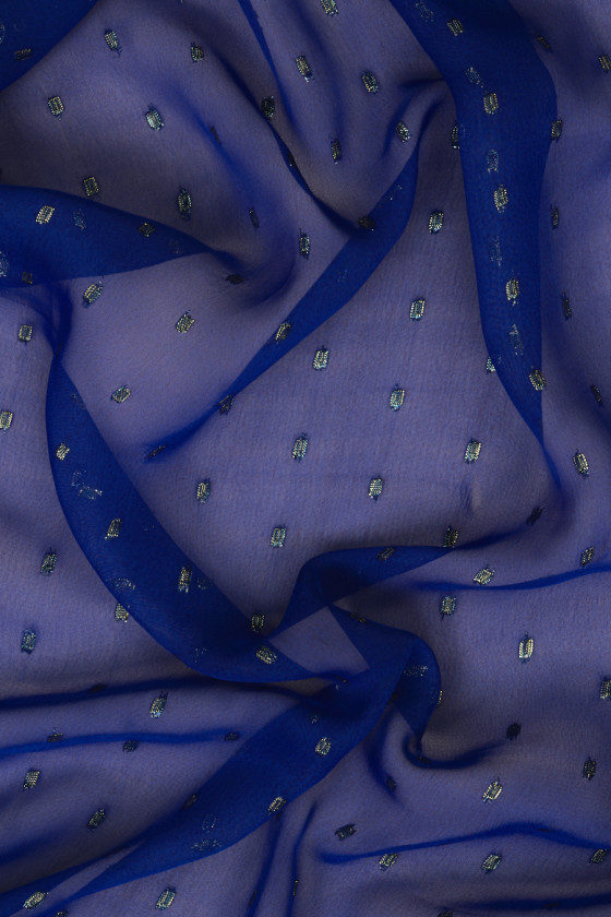 Włoski szyfon poliestrowy w kolorze chabrowym z motywem drobnych, geometrycznych wzorków wykonanych ze złotej nitki lureksowej. Tkanina jest cienka i lejąca, dlatego idealnie sprawdzi się do uszycia zwiewnej sukienki, bluzki lub szala. Fantastyczna propozycja dla fanów ciemniejszych, lekko błyszczących tkanin.