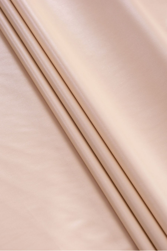 Bardzo dobrej jakości eko -skóra w kolorze jasnego , ciepłego beżu z kroplą różu. Tkanina zrobiona z włókien syntetycznych , elastyczna, do złudzenia przypomina skórę naturalną. Polecamy do uszycia dopasowanych ubrań - spódnic, spodni itp.