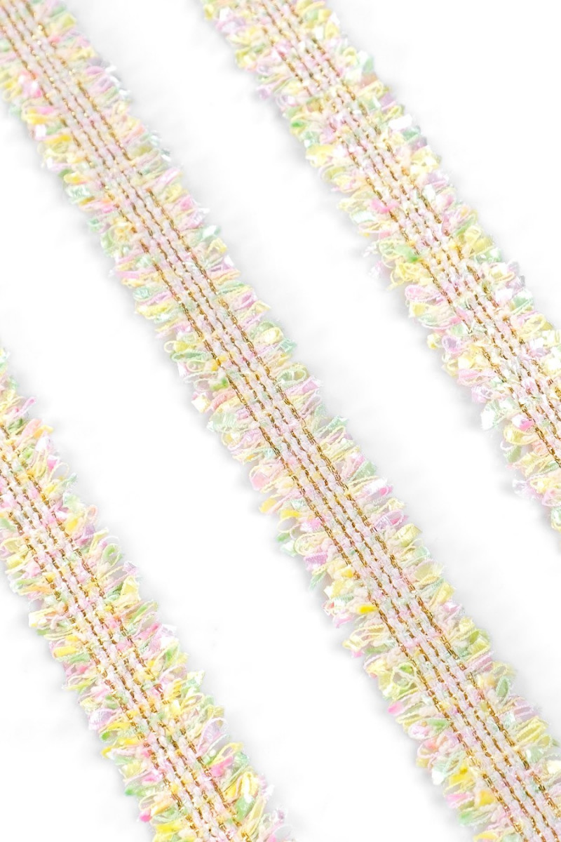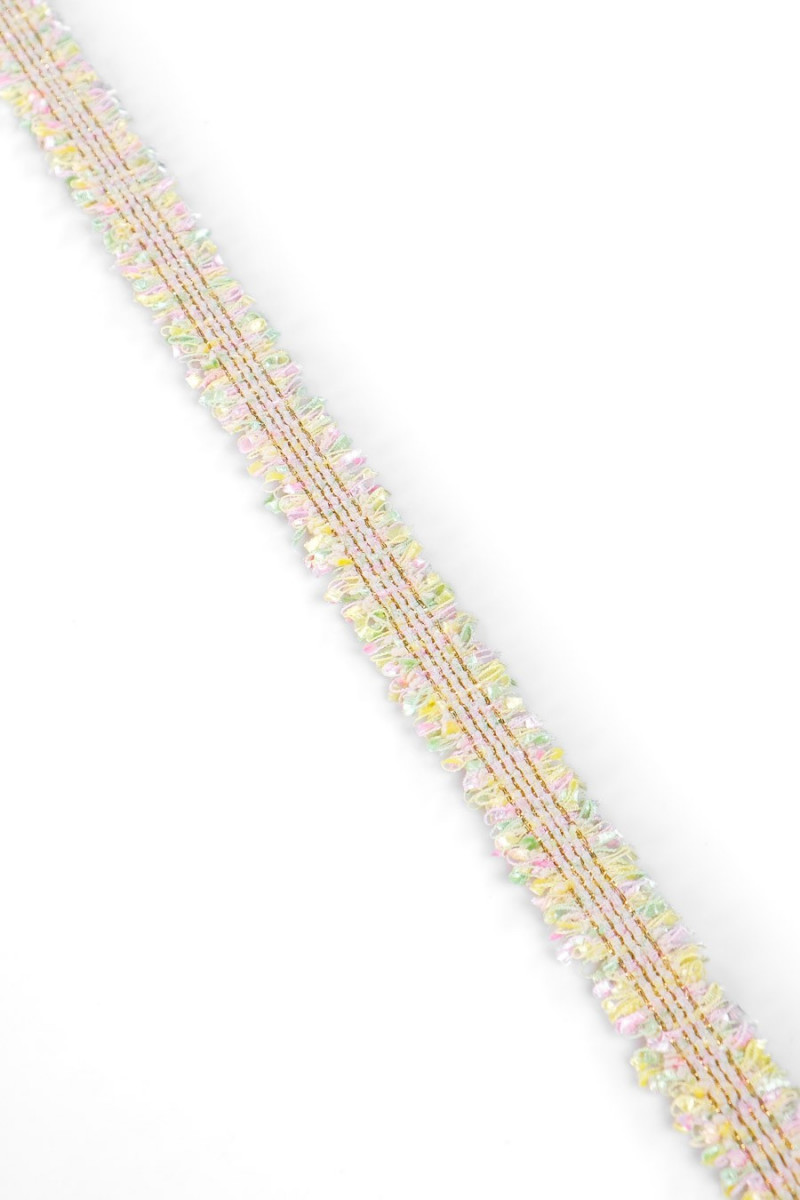 Włoska taśma pasmanteryjna typu chanel w kolorach: ecru, miętowy, jasna zieleń, jasny róż, ozdobiona złotą nitką lureksową. Szerokość: 2,5 cm