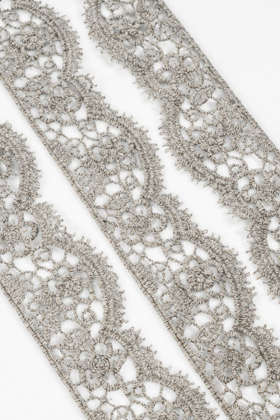 Taśma pasmanteryjna - wełniana z nitką lureksową. Jednostronnie wykończona zębem, szerokość 7 cm.