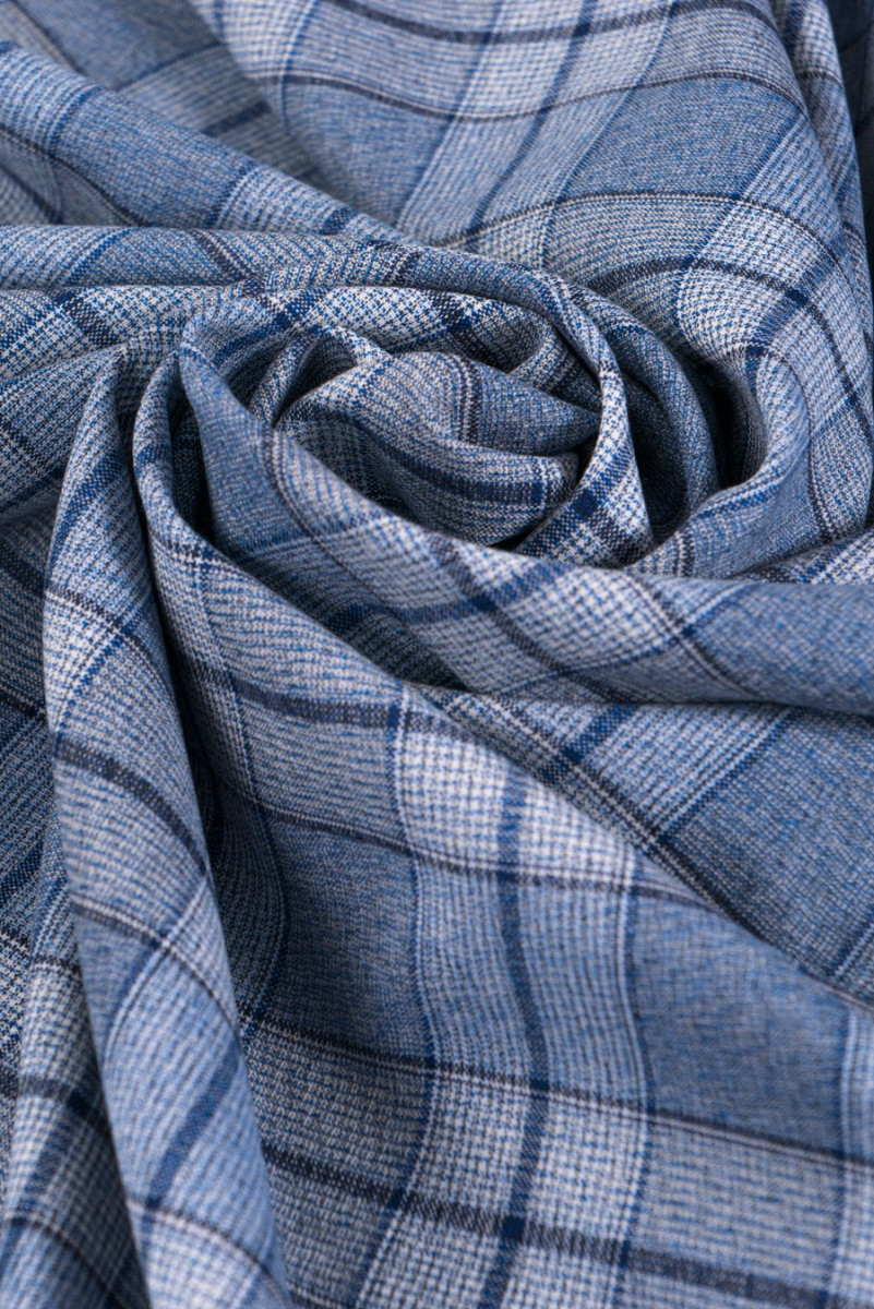 Włoska wełna kostiumowa w kratę w odcieniach niebieskiego i ecru, utkana w 100% z wełny vergin.