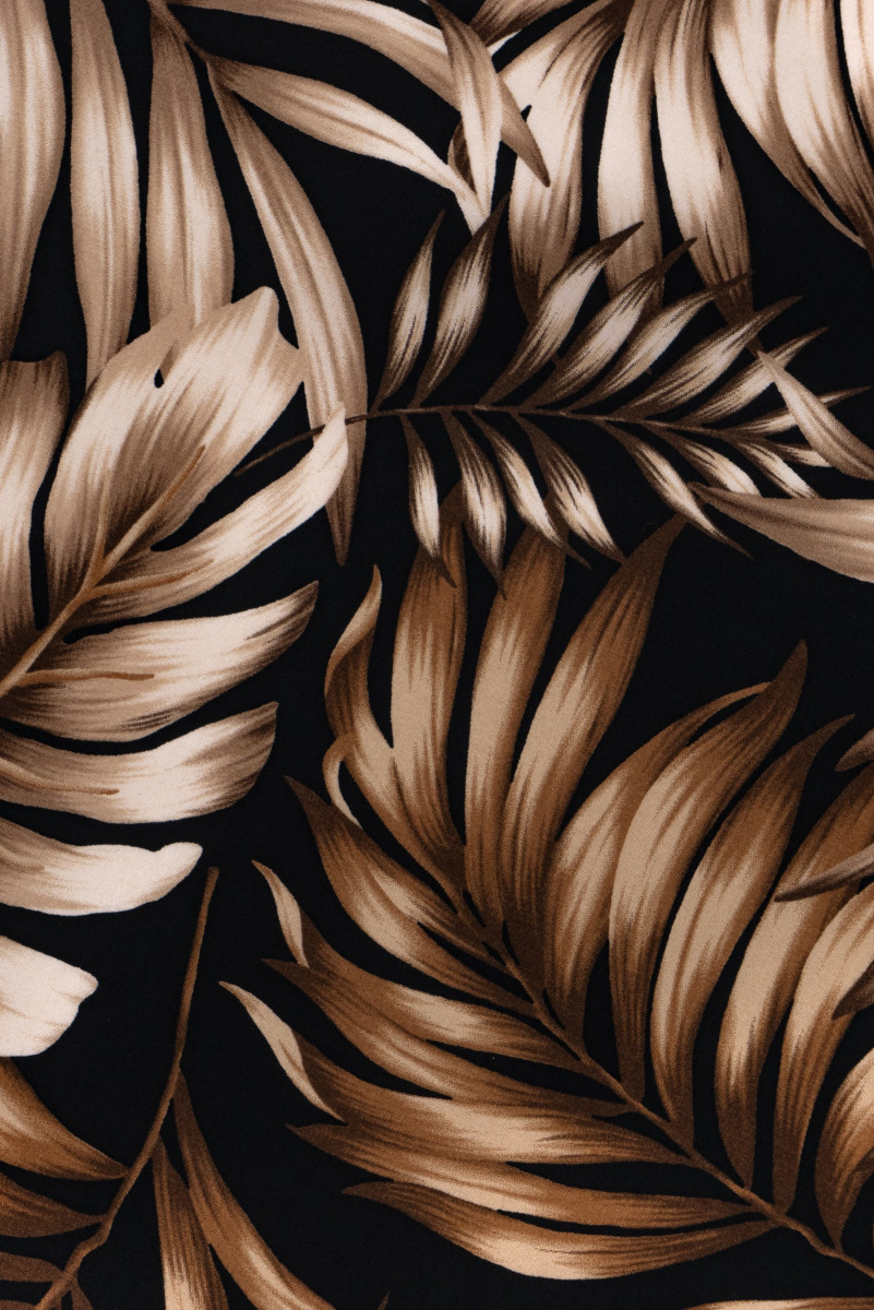 Włoska tkanina 100% wiskozowa w kolorze czarnym z motywem beżowo-brązowych, dużych liści. Wiskoza to tkanina naturalna (pozyskiwana z celulozy), bardzo miękka, przewiewna, matowa - idealna do uszycia letniej sukienki, bluzki lub spódnicy.