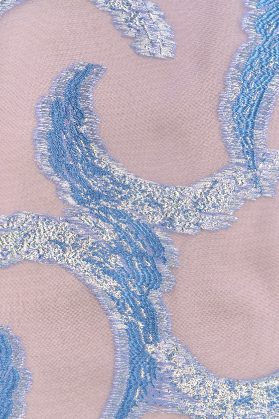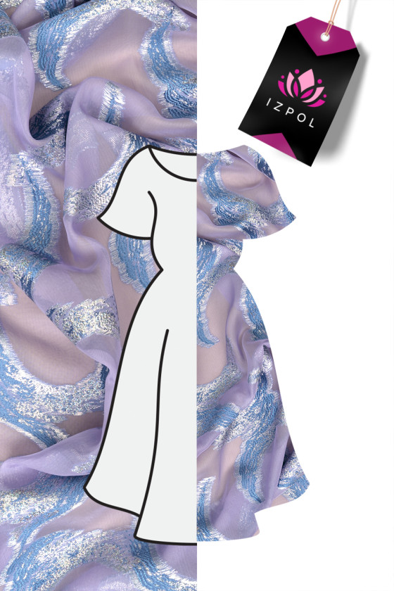 Włoski szyfon wiskozowy z domieszką poliestru w kolorze wrzosowym. Bardzo ciekawy motyw przypominający księżyce w kolorze niebiesko-srebrnym, wzór jest utkany w technice devore i ozdobiony błyszczącą nitką lureksową. Tkanina jest cienka, transparentna, delikatnie sztywno się układa, dlatego idealnie sprawdzi się do uszycia letniej sukienki, bluzki lub szala. Fantastyczna propozycja dla fanów oryginalnych, lekko błyszczących tkanin.