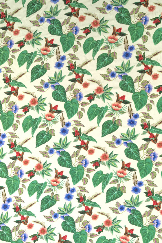 Włoska tkanina 100% wiskozowa w kolorze jasnego beżu z gęstym motywem egzotycznych kwiatów oraz liści. Druk wykonano w kolorystyce zieleni, fuksji. chabru oraz beżu i czerwieni. Tkanina jest miękka i kryjąca o płóciennym splocie, bardzo przyjemna w dotyku. Ten gatunek idealnie sprawdzi się na letnie, upalne dni.