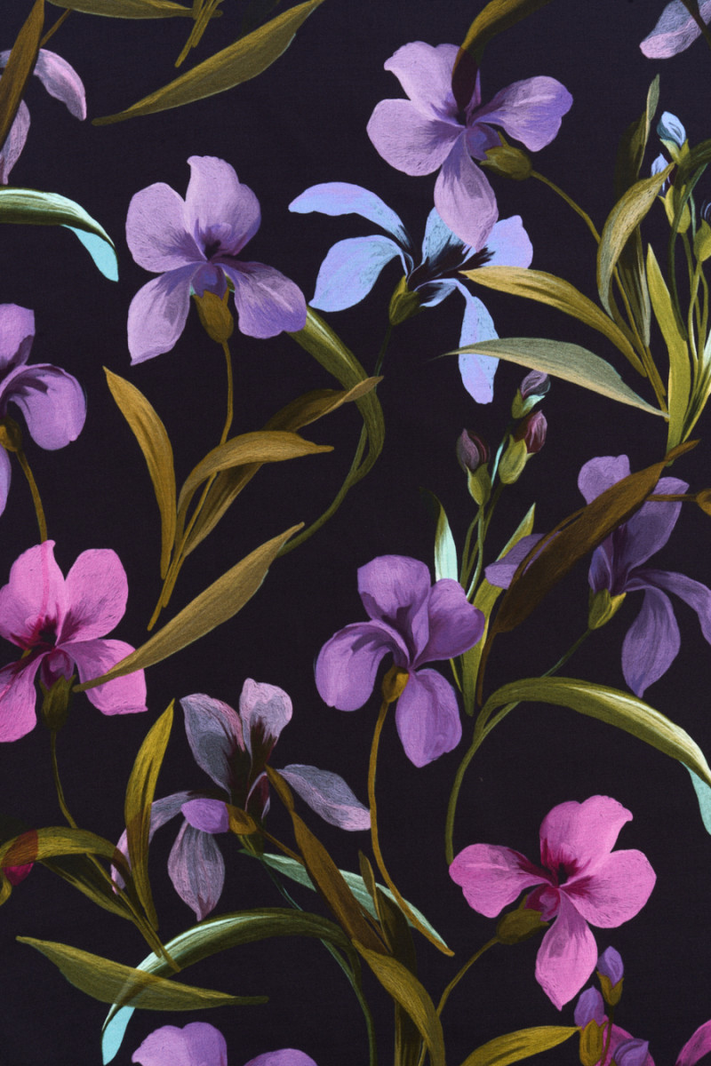 Włoska satyna wiskozowa w motyw kolorowych kwiatów i podłużnych liści na czarnym tle. Gęsto położony roślinny wzór wykonany w odcieniach fioletu, fuksji i zieleni, kwiaty o wielkości około 7 cm * 7 cm. Tkanina jest nieelastyczna, lejąca, delikatna w dotyku, miękka i pięknie się układa. Fantastyczna propozycja dla osób szukających wyjątkowych i ciekawych materiałów z przeznaczeniem na koszule, spódnice, sukienki lub chusty.