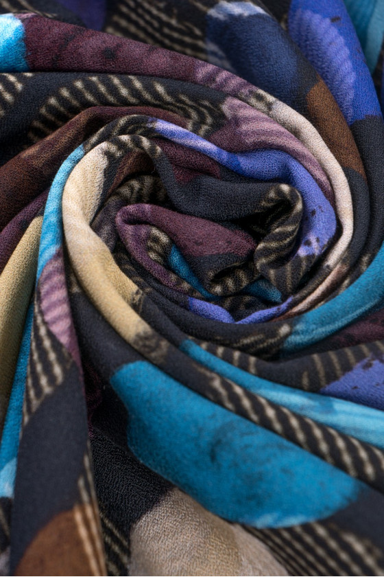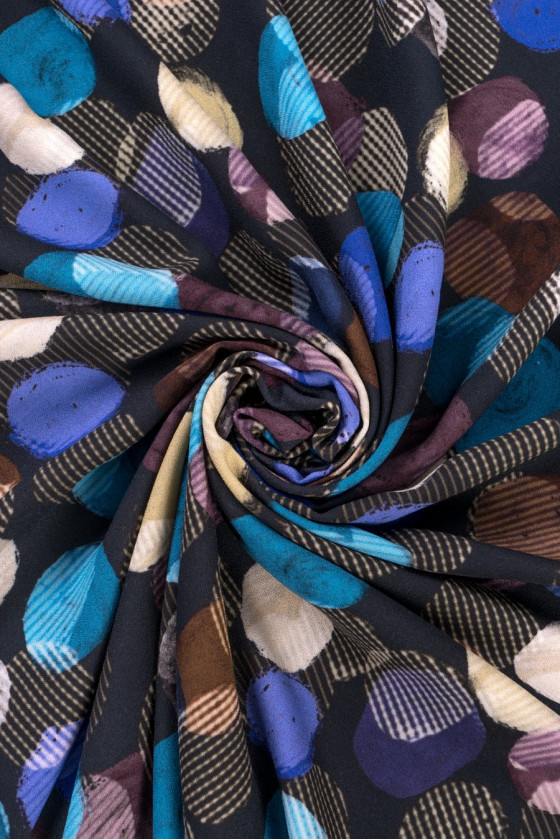 Mięsista, nietransparentna żorżeta wiskozowa we wzór dużych , kolorowych kółek.