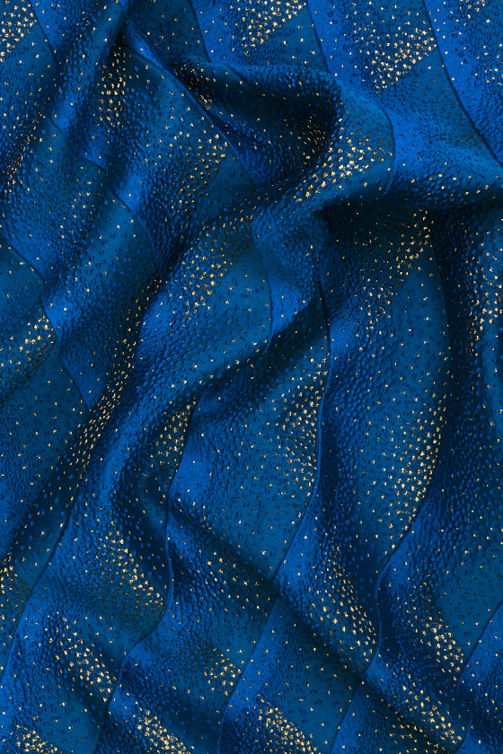 Włoska tkanina kostiumowa typu żakard w kolorze niebieskim nakrapiana złotem. Tkanina utkana we wzór niebieskich fal ozdobionych niebieskimi i złotymi kropkami. Materiał ma wypukłą strukturę, jest miękki, cienki ale kryjący. Piękna propozycja do uszycia sukienki, spódnicy oraz marynarki na wyjątkowe okazje.