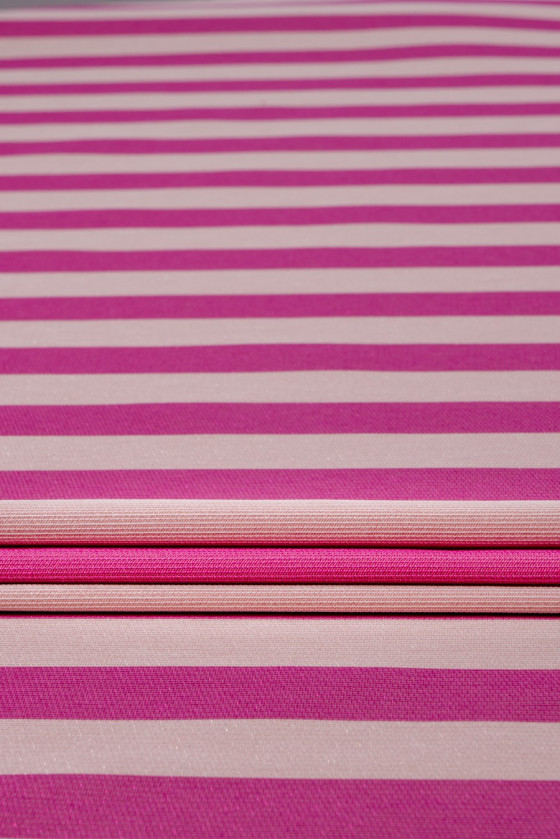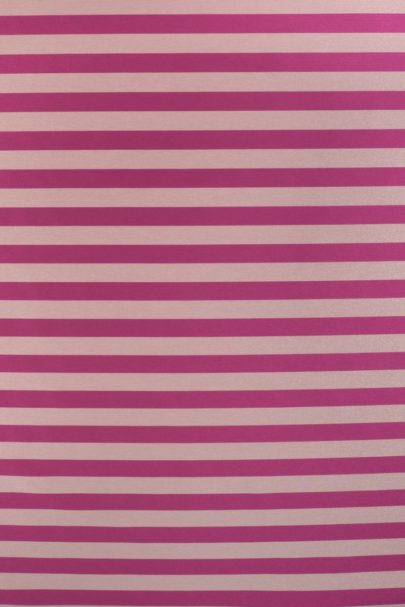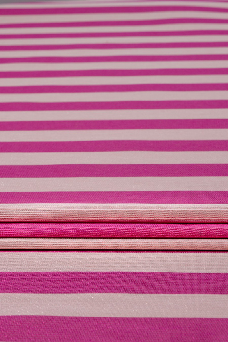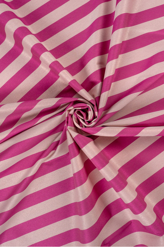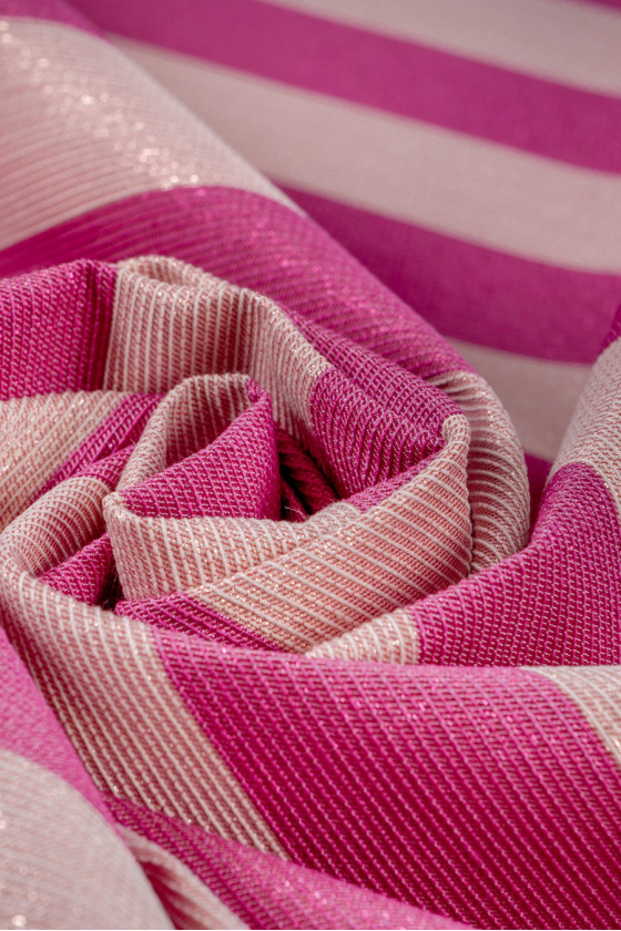 Elegancki żakard w pasy o szerokości 4 cm w kolorach jasnego różu i pinku, które mienią się nitką lureksową.