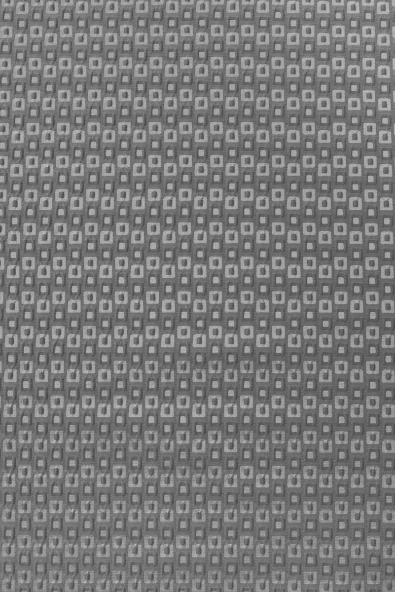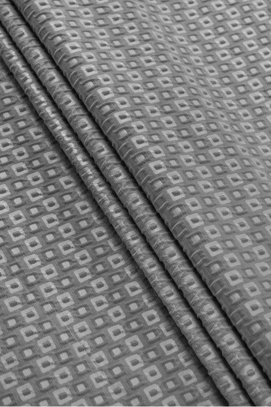 Włoska tkanina kostiumowa typu żakard w kolorze szarym utkany w mały, geometryczny wzór jaśniejszych i ciemniejszych kwadracików. Sposób utkania tworzy karbowanie tkaniny, co daje efekt 3D. Tkanina stabilna, zrobiona z poliestru 100%, bardzo dobrej jakości. Polecamy na eleganckie sukienki, spódnice, żakiety lub cienkie płaszczyki lub jako tkaninę dekoracyjna.