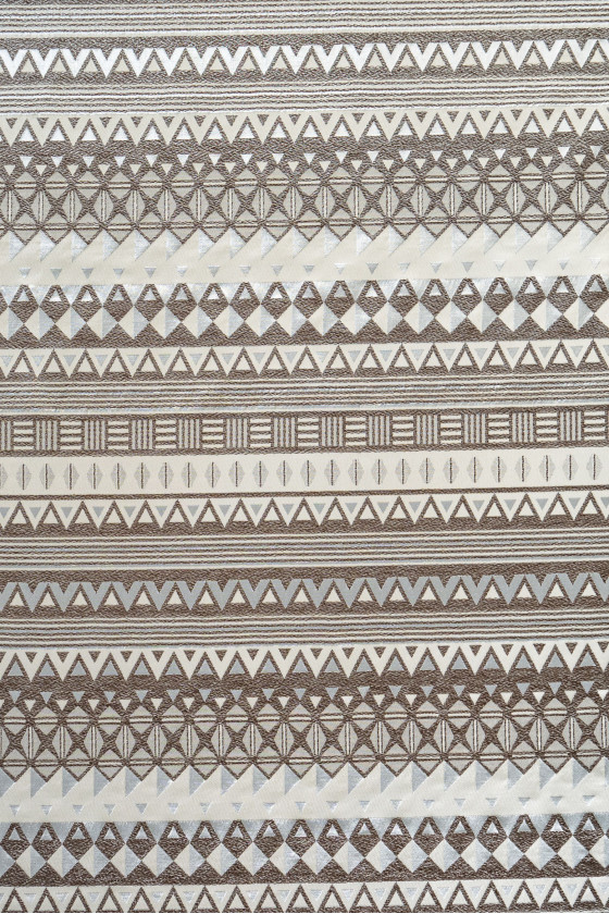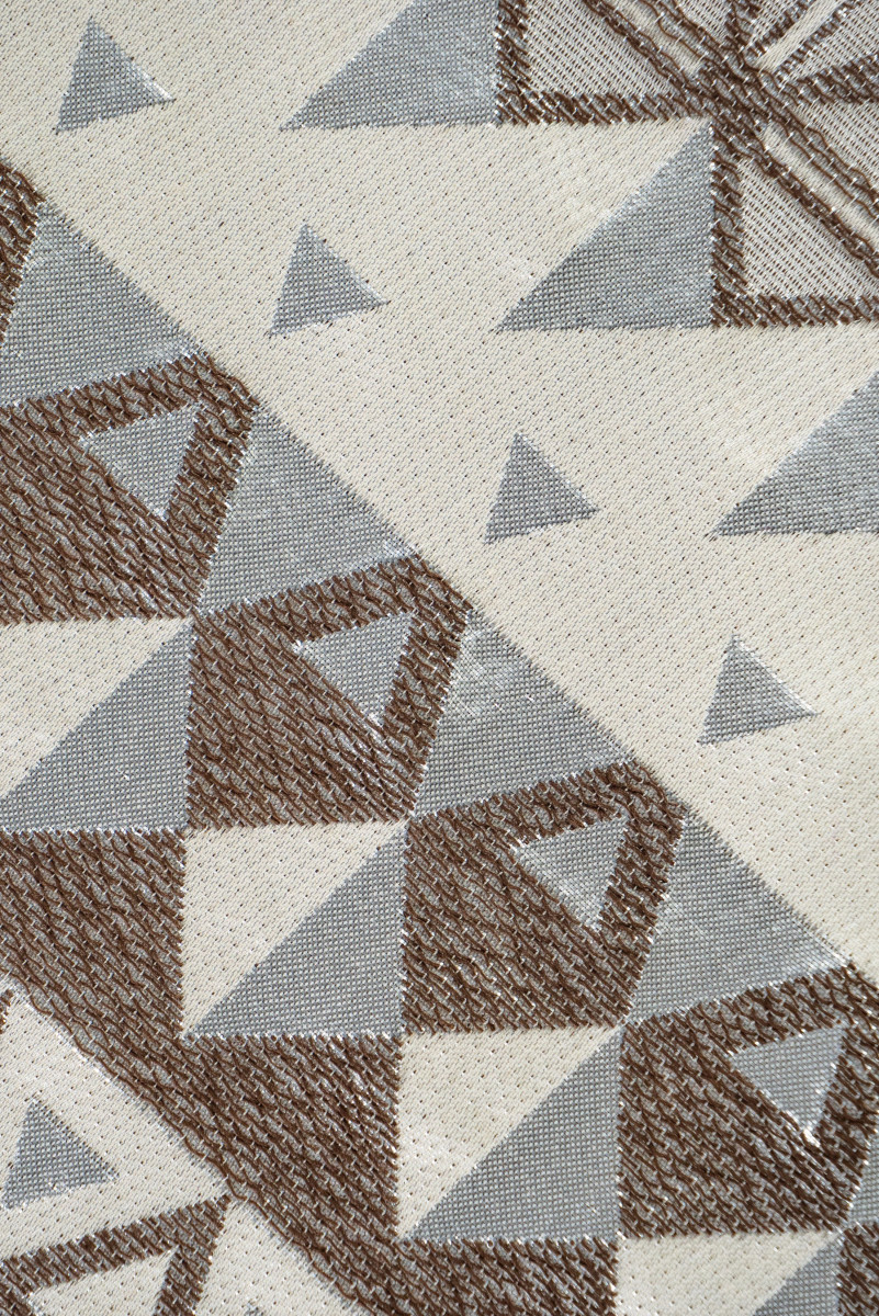 Włoska tkanina kostiumowa typu żakard w drobne wzory geometryczne w kolorze beżowo-brązowym, ozdobiona srebrną nitką lureksową. Tkanina cieńsza, lekko sztywna.