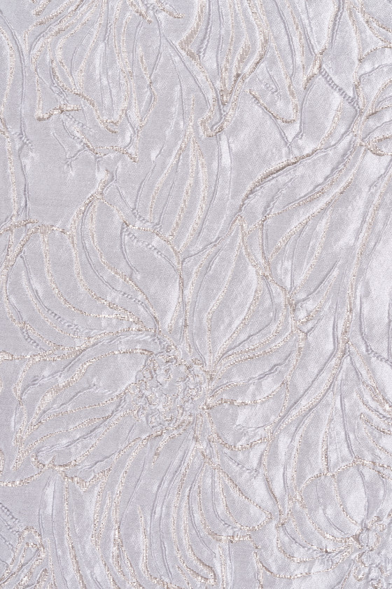 Włoska tkanina kostiumowa typu żakard w kolorze szaro-platynowym z motywem, dużych, lekko wypukłych kwiatów. Tkanina średniej grubości, nieelastyczna, sztywna.