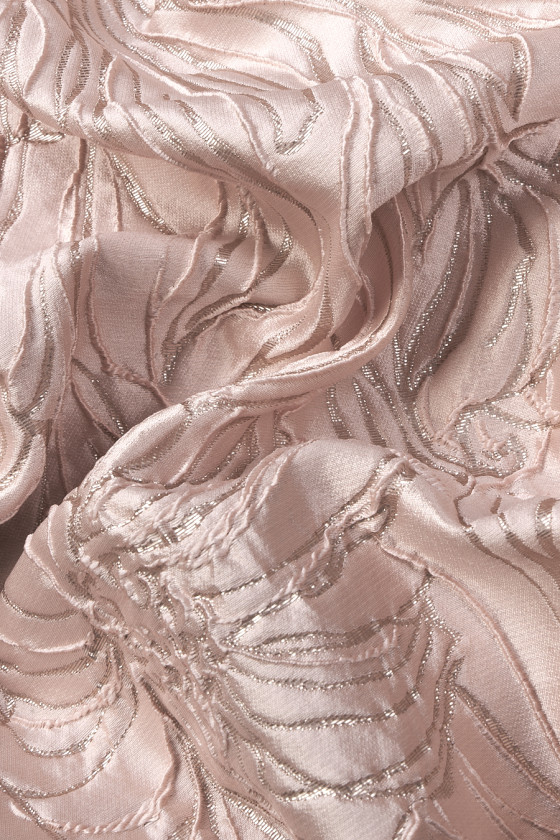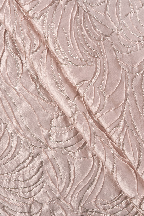 Włoska tkanina kostiumowa typu żakard w kolorze pudrowo-platynowym z motywem, dużych, lekko wypukłych kwiatów. Tkanina średniej grubości, nieelastyczna, sztywna.
