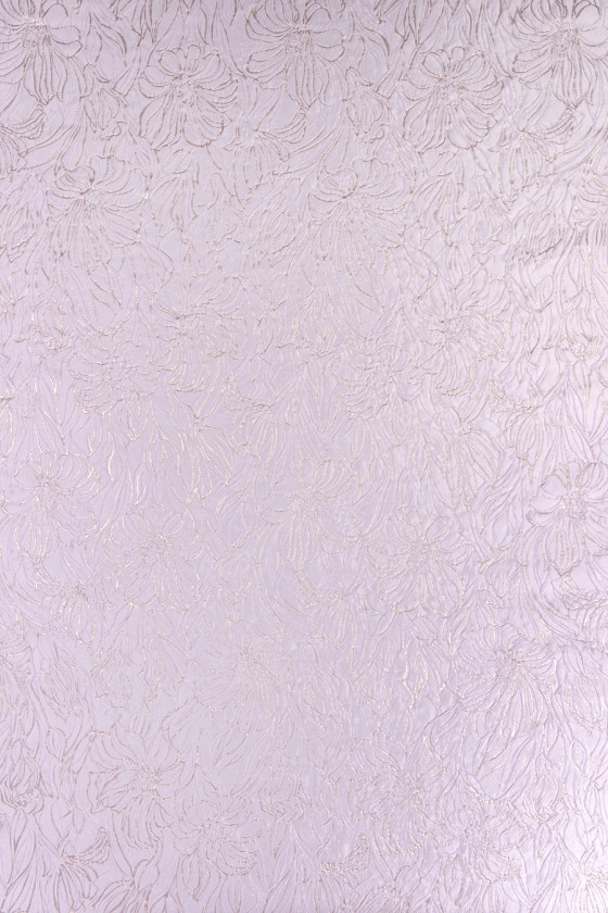 Włoska tkanina kostiumowa typu żakard w kolorze liliowo-platynowym z motywem, dużych, lekko wypukłych kwiatów. Tkanina średniej grubości, nieelastyczna, sztywna.
