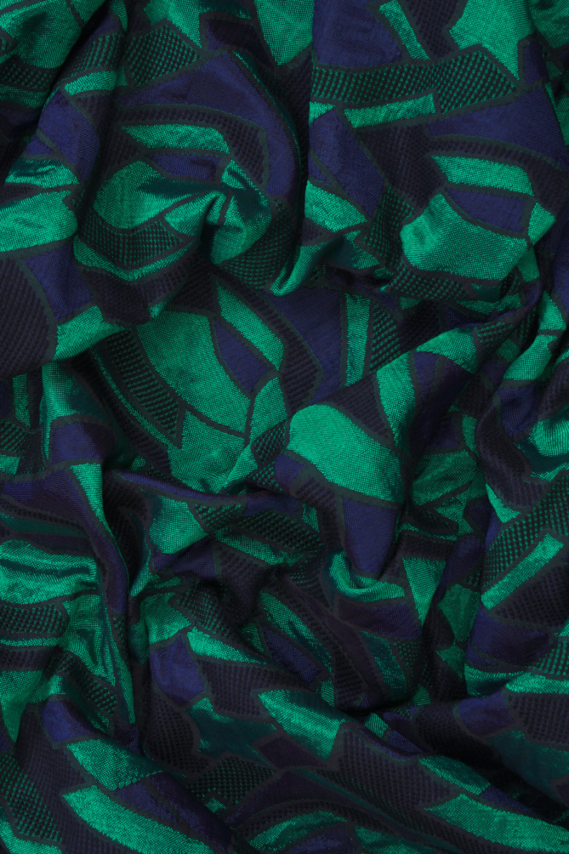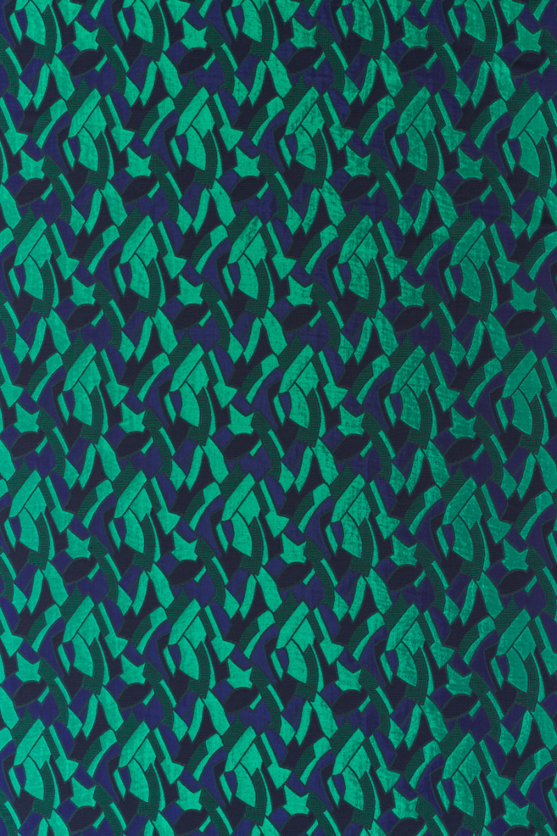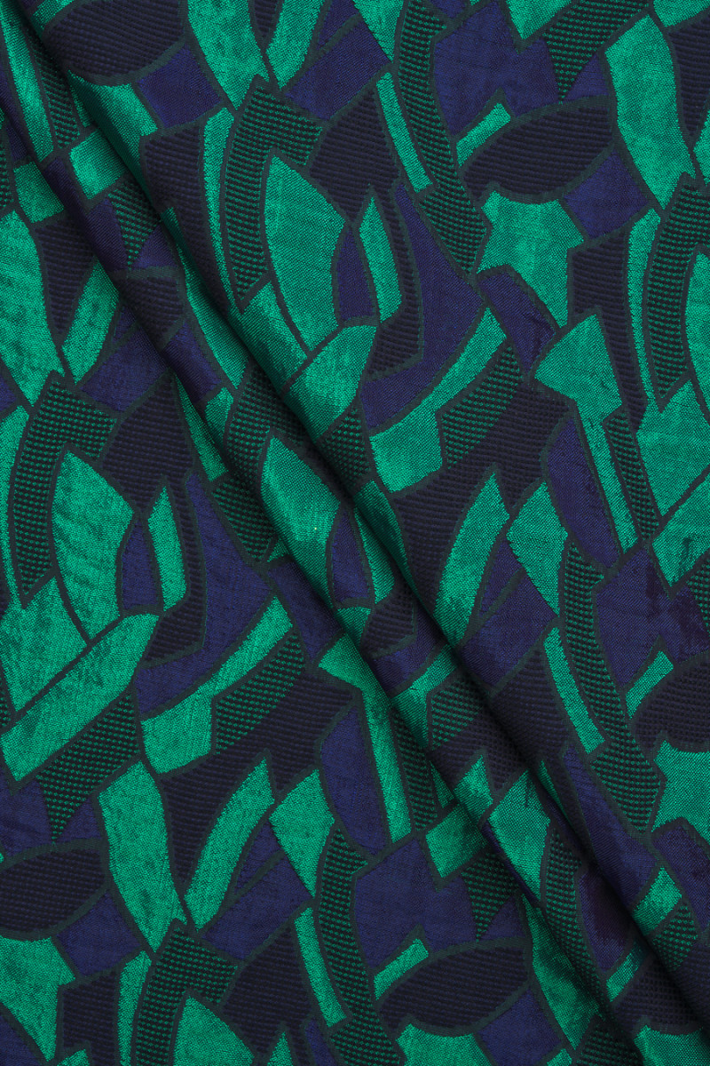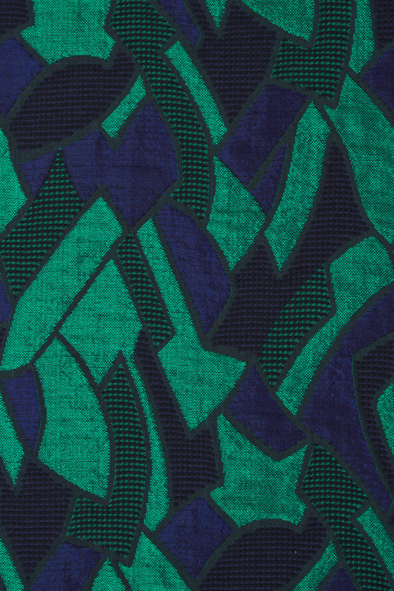 Włoska tkanina kostiumowa typu żakard w ciekawy geometryczny wzór w kolorach granatu i zieleni. Tkanina ma lekko wypukłą strukturę, jest miękka, kryjąca, nieelastyczna, średniej grubości. Doskonałe połączenie kolorystyczne wykończone delikatnym połyskiem tworzy interesujący wygląd tkaniny, z której można wyczarować marynarkę, spódnice, sukienkę a nawet płaszczyk.