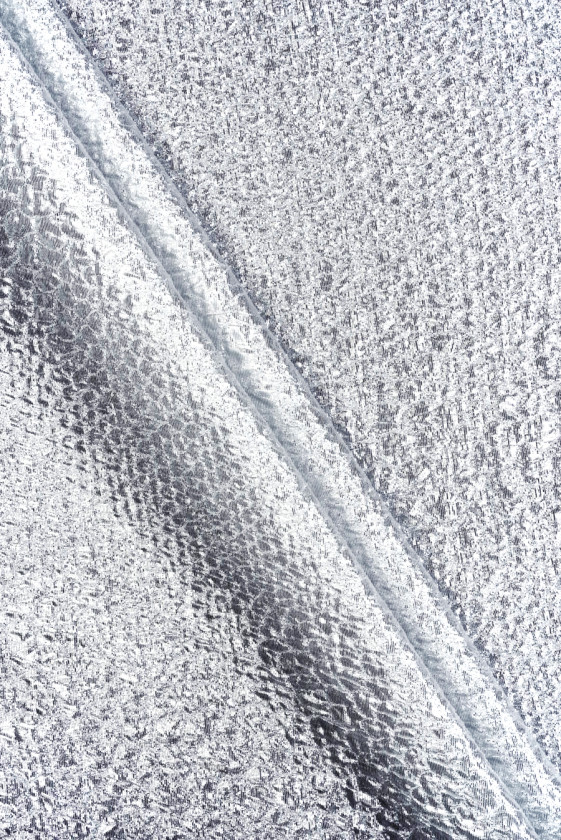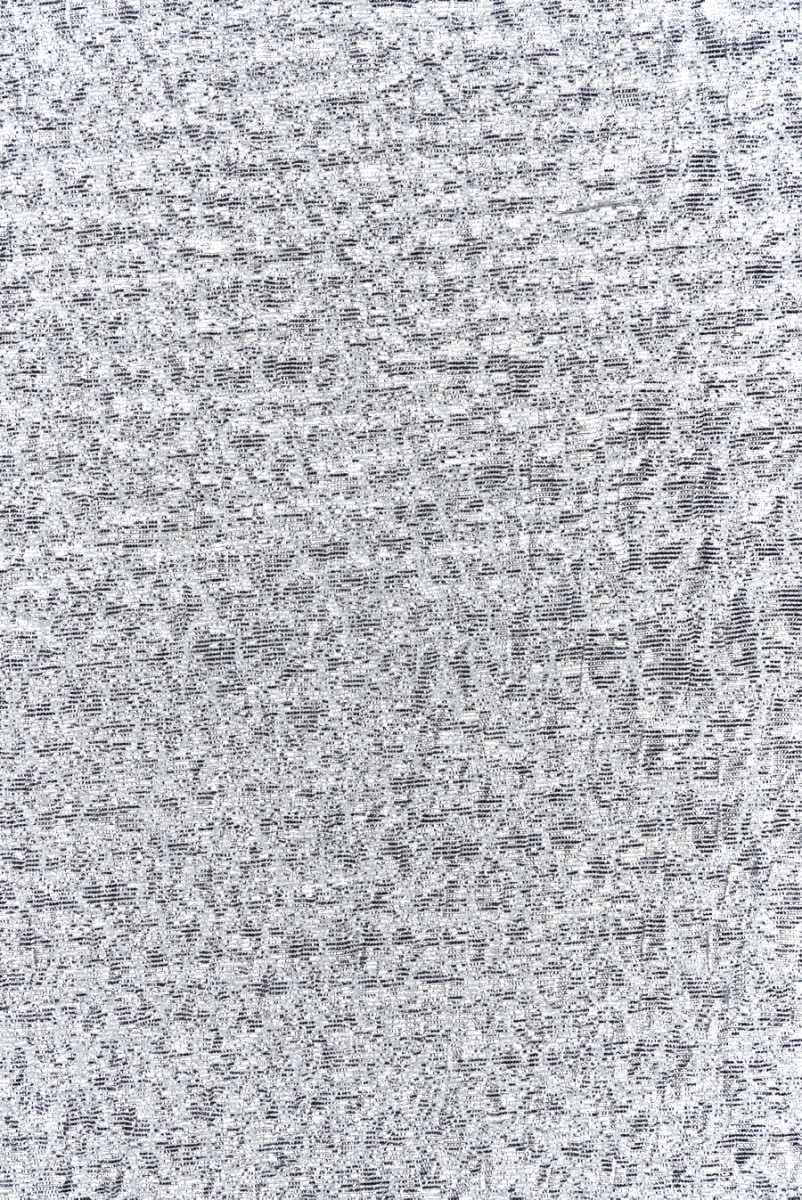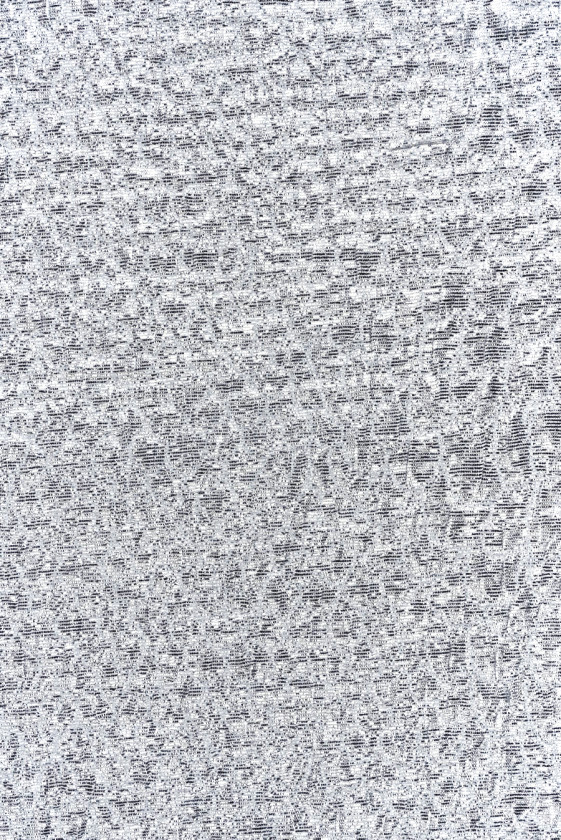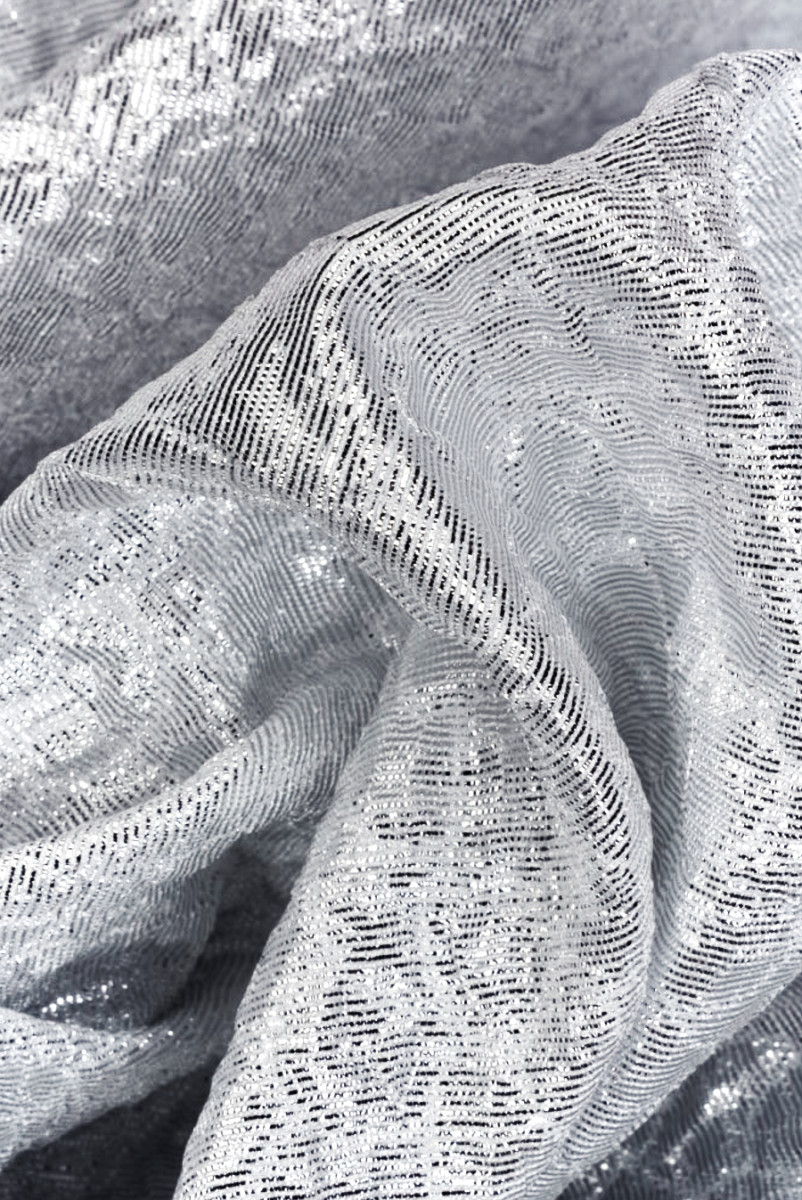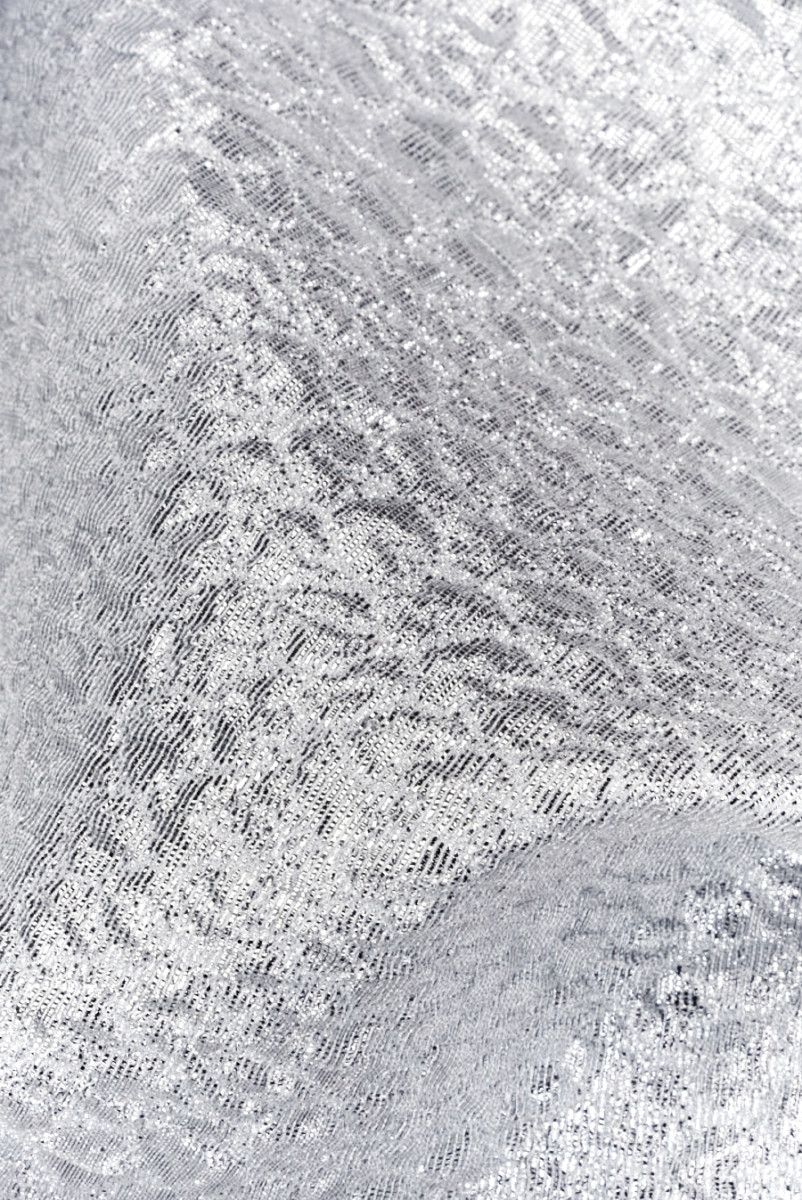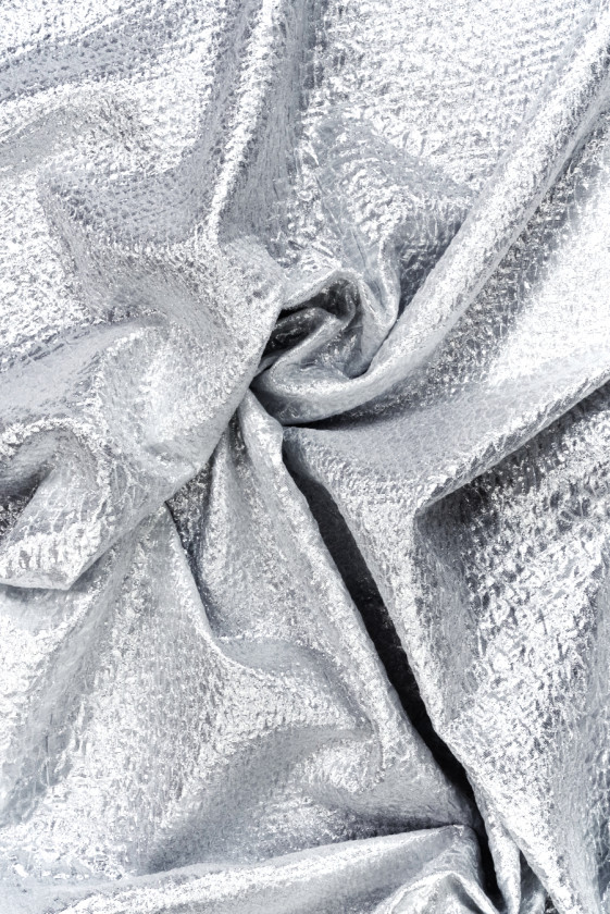 Tkanina poliestrowa żakardowa z motywem srebrnych, wypukłych elementów. Wzór jest gęsty ale raczej mały, a w swojej strukturze przypomina skórę węża. Tkanina jest cienka, ale kryjąca, nieelastyczna, lekka, układa się sztywno i ma duży połysk dzięki użytej srebrnej nitki. Specjalna propozycja dla osób, które lubią błyszczeć. Można z niej wyczarować ciekawe sukienki, spódnice, żakiety i marynarki.