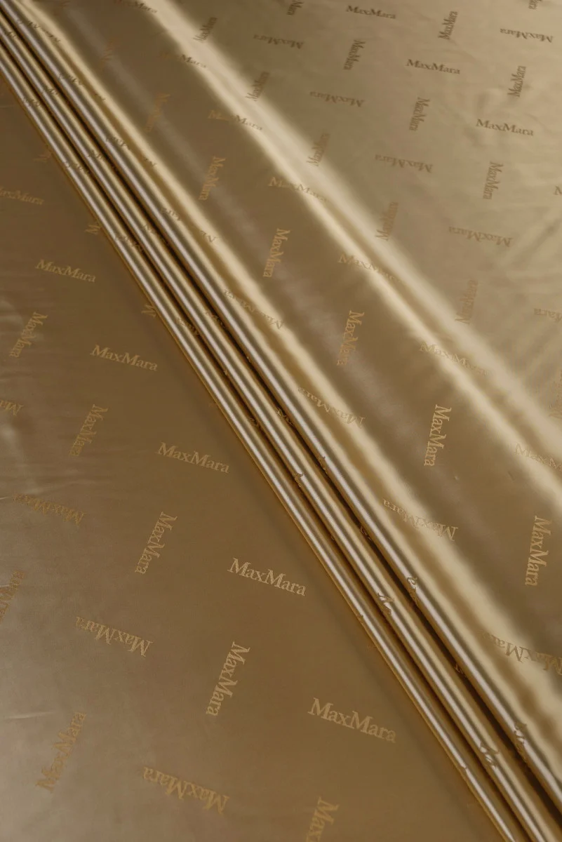 Włoska podszewka wiskozowa w kolorze beżowym o splocie satynowym. Tkanina sygnowana nazwą znanego Domu Mody.