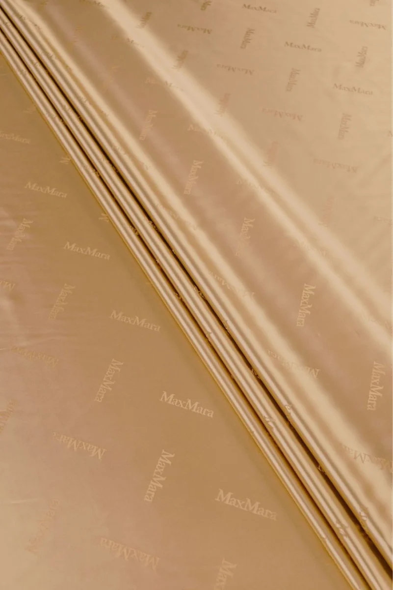 Włoska podszewka wiskozowa w kolorze beżowym o splocie satynowym. Tkanina sygnowana nazwą znanego Domu Mody - nieelastyczna, błyszcząca, grubsza. Idealna na podszycia płaszczy, kurtek, kamizelek, marynarek.