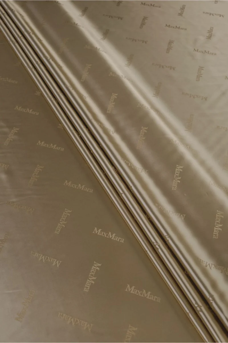 Włoska podszewka żakardowa 100% wiskozowa w kolorze beżowo szarym, sygnowana nazwą znanego, włoskiego Domu Mody.