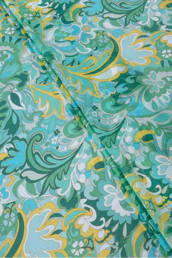 Włoski szyfon poliestrowy, kreszowany w zielono-turkusowe, fantazyjne motywy kwiatów i liści. Szyfon kreszowany to tkanina cienka, transparentna, zwiewna, delikatna o ciekawej, gniecionej strukturze.