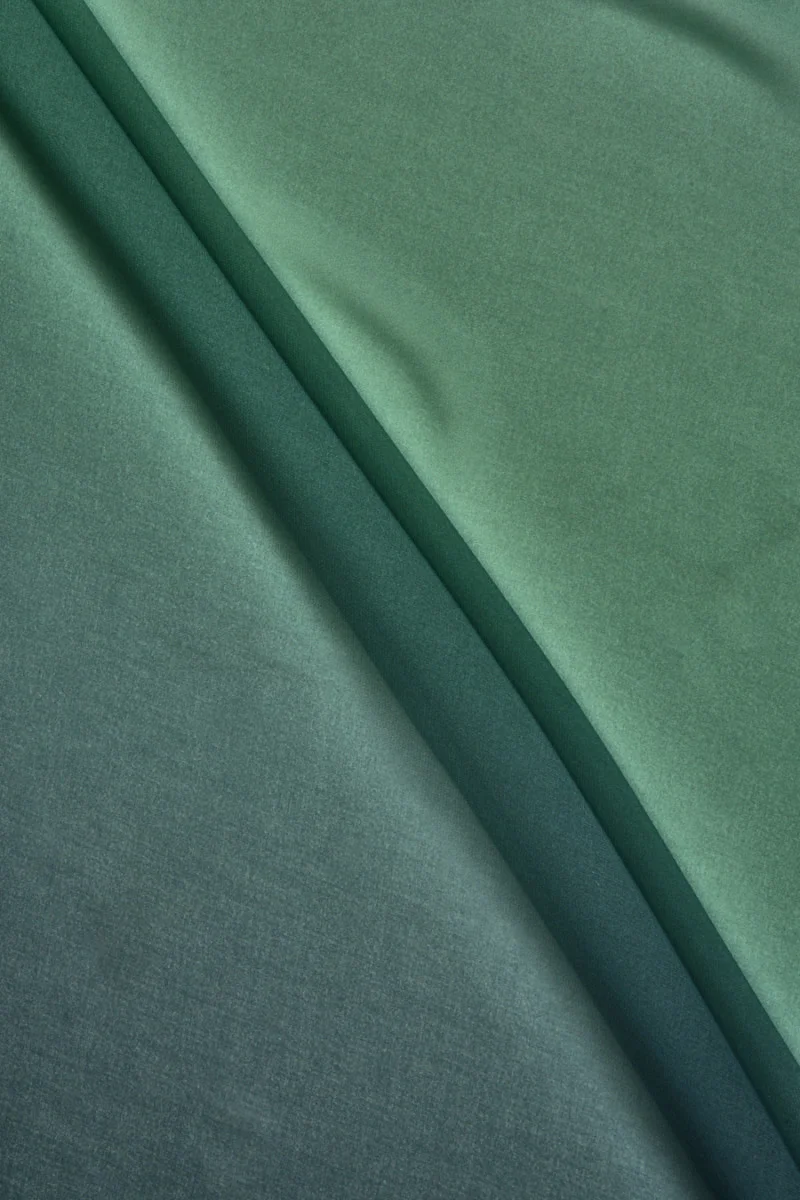 Szyfon poliestrowy ombre w odcieniach zieleni. Wzór przechodzi z koloru niebieskiego na jednym brzegu tkaniny, przez odcienie zieleni, do grafitu na drugim brzegu - polecamy szyć obwodowo. Tkanina jest bardzo zwiewana, lekka, lejąca, lekko transparentna i nieelastyczna. Wspaniała propozycja w jesiennych barwach, która sprawdzi się w uszyciu sukienki, spódnicy, a także tuniki czy koszuli.