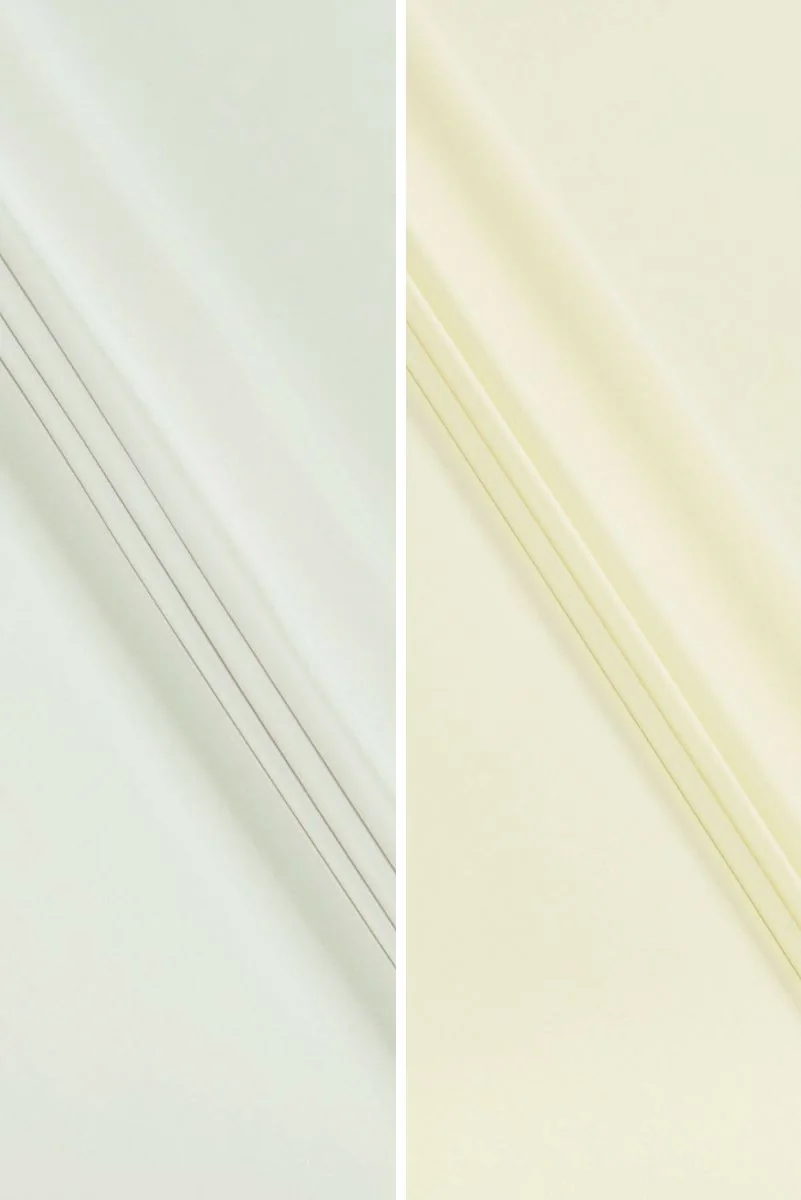 Włoska tkanina poliestrowa z dodatkiem elastanu w dwóch kolorach: śmietanowym i waniliowym. Tkanina o gładkim, delikatnie śliskim, diagonalnym splocie z przeznaczeniem na wiosenne trencze. Materiał jest elastyczny w dwie strony, chłodny w dotyku i troszkę sztywno się układa. Sprawdzi się także do uszycia spódnicy, spodni lub sukienki.