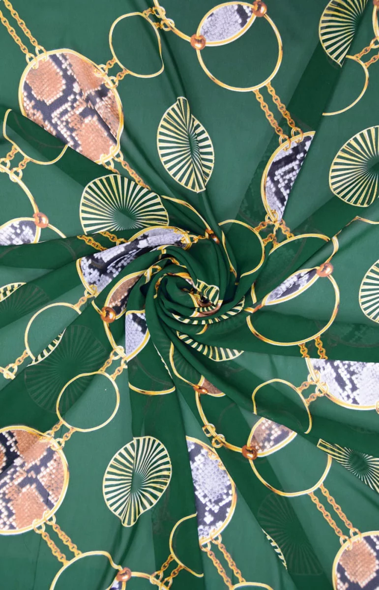 Szyfon z poliestru w fantazyjny wzór biżuteryjny (koła o średnicy 12-15 cm) jest tkaniną bardzo delikatną, zwiewną, transparentną. Idealna na zwiewne sukienki, spódnice bluzeczki lub pareo. Tkanina nieelastyczna. Kolorystyka: na butelkowo-zielonym tle