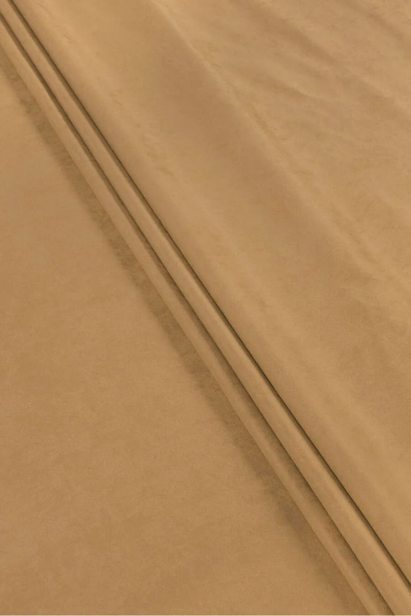 Włoska tkanina typu alcantara w kolorze kamelowego beżu. Materiał jest grubszy i elastyczny, z obu stron z charakterystycznym włoskiem, przypominającym zamsz. Bardzo miękki i przyjemny w dotyku. Idealnie sprawdzi się do uszycia spódnicy, sukienki, kurtki lub płaszcza.