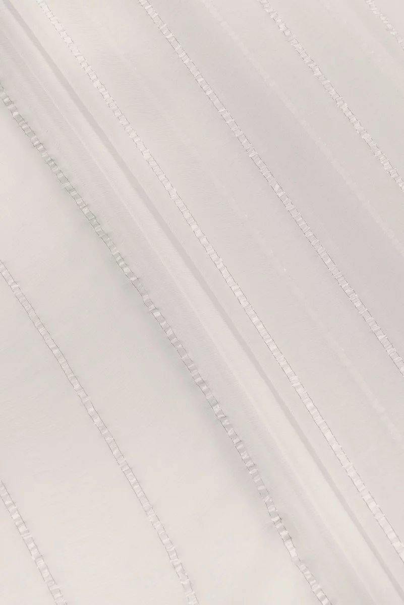 Szyfon z jedwabiu naturalnego kreszowany z lurexem jest tkaniną bardzo delikatną, zwiewną, transparentną. Idealna na eleganckie zwiewne sukienki oraz bluzeczki. Tkanina elastyczna - pracuje na nitkach. Kolorystyka: ecru ,co 7 cm dyskretny paseczek ze srebrną nitką lurexową.