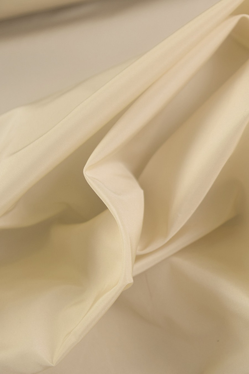 Tafta w kolorze jasno-beżowym to tkanina gładka, z połyskiem i lekko sztywna. Idealna na eleganckie kreacje wizytowe- sukienki, spódnice i cienkie płaszczyki.