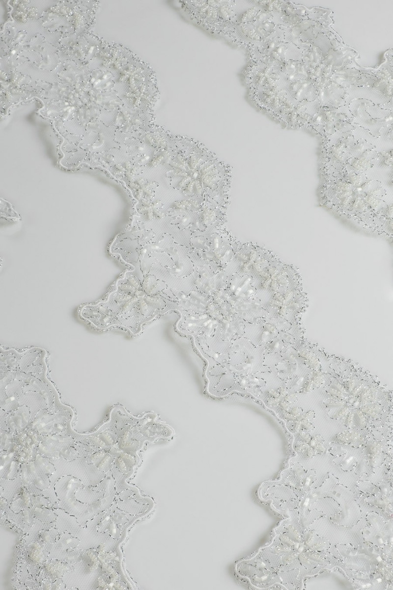 Zjawiskowa, włoska taśma koronkowa z koralikami w kolorze optycznej bieli. Motyw drobnych kwiatków naszyto na białym tiulu. Idealna do wykończenia tkanin ślubnych i wieczorowych.