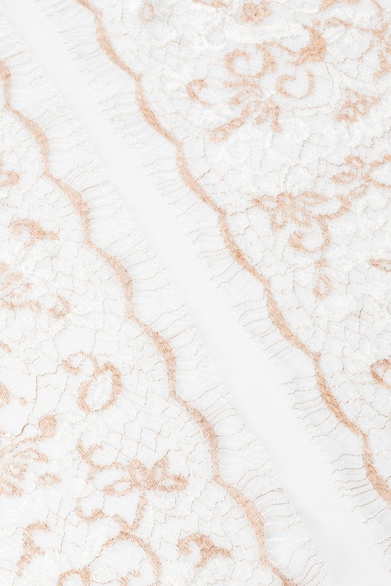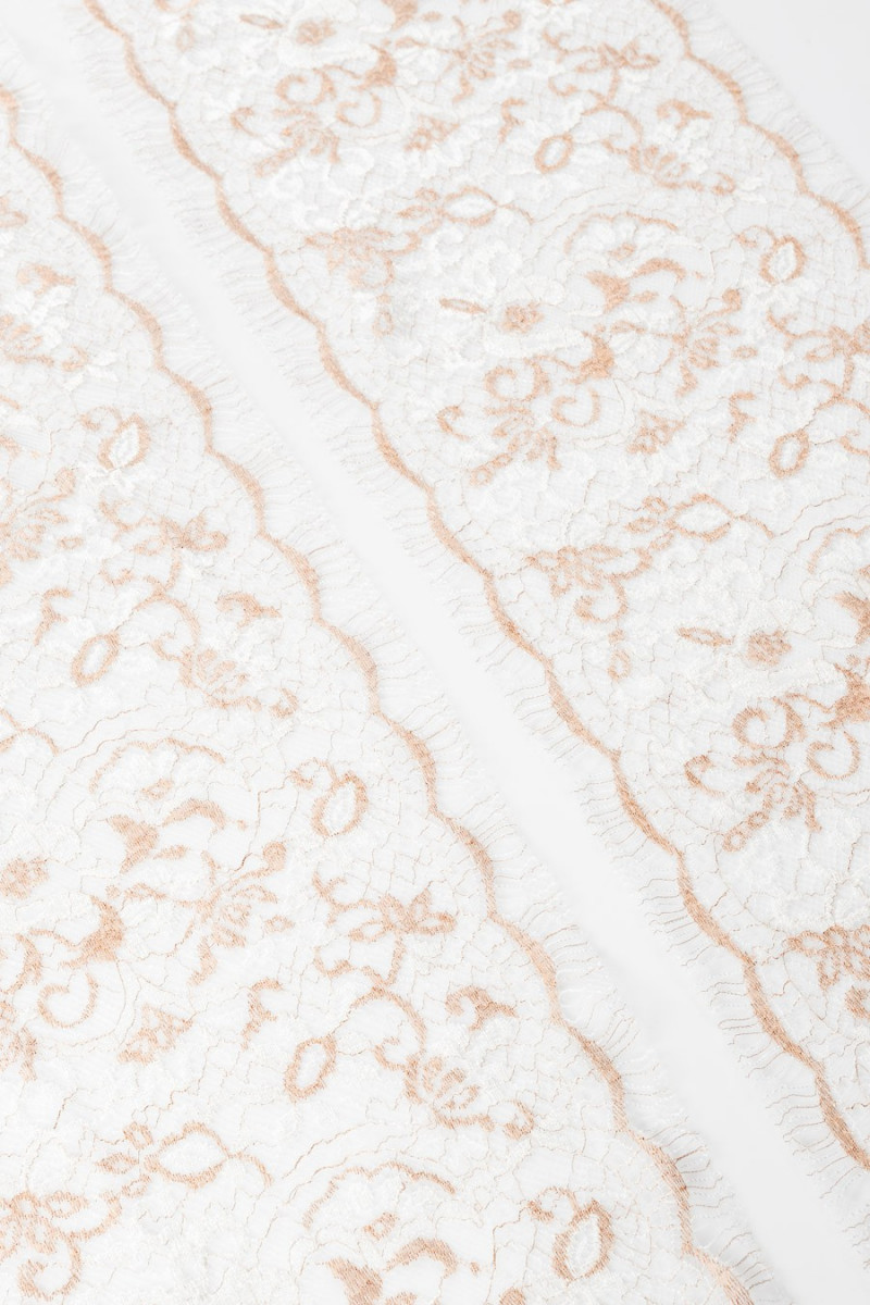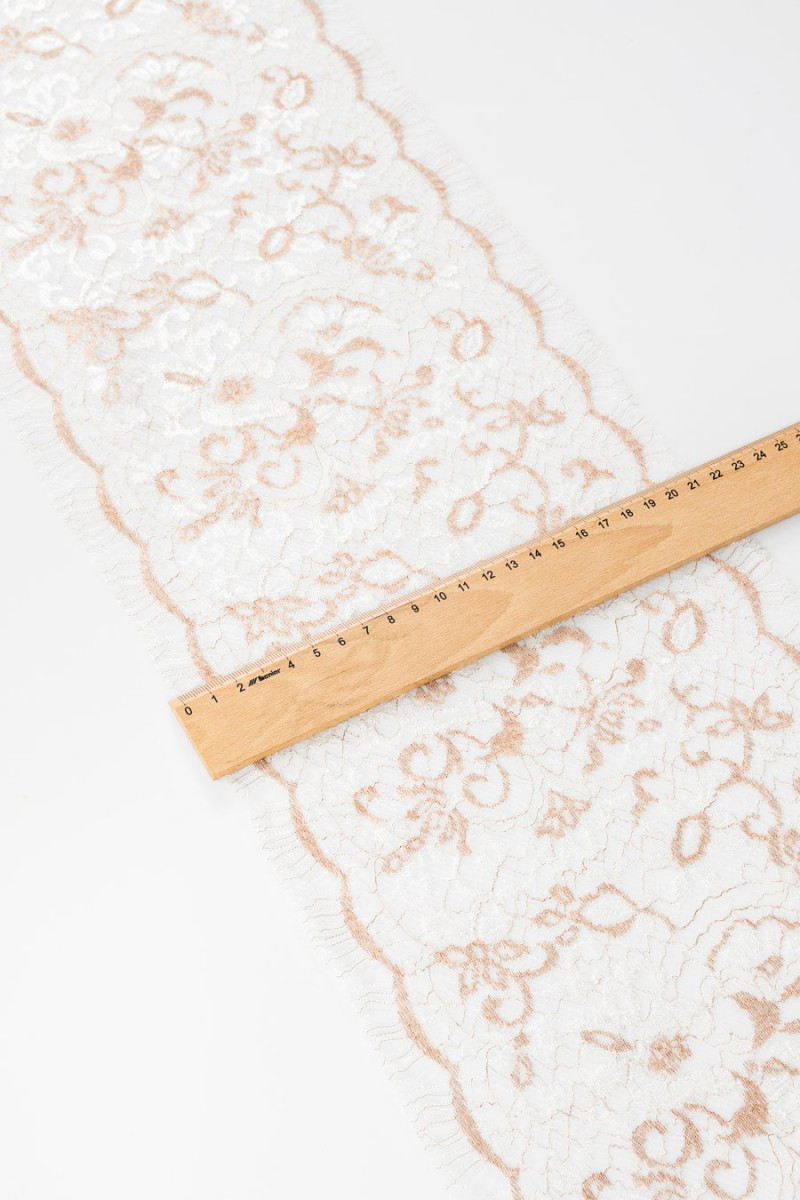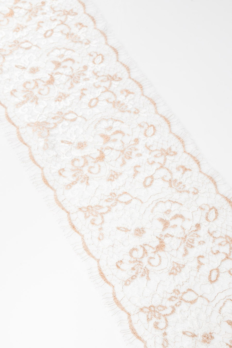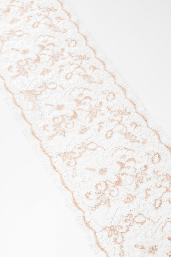 Włoska taśma koronkowa w kolorze biało-miedzianym, obustronnie wykończona zębem (do wycięcia). Motyw kwiatowy. Szerokość: 20 cm