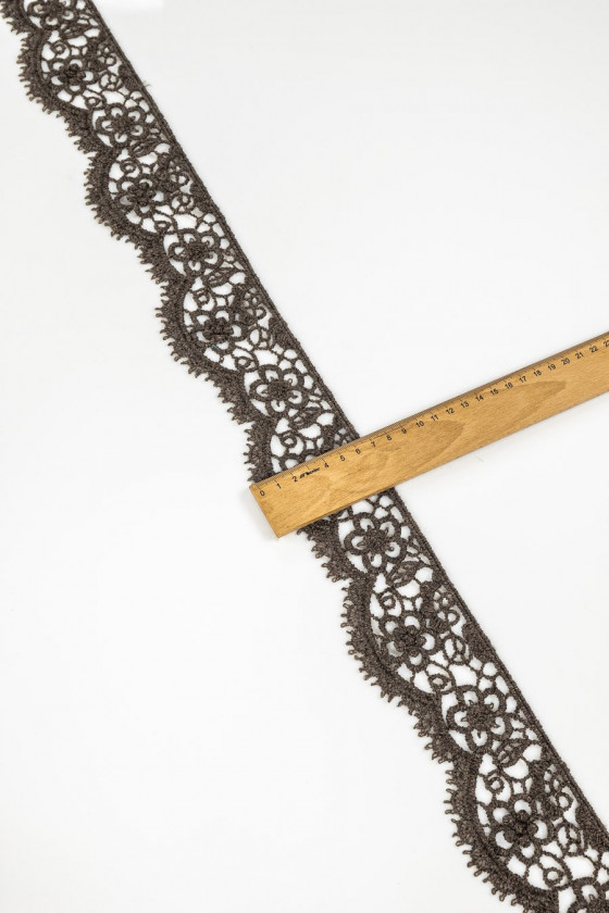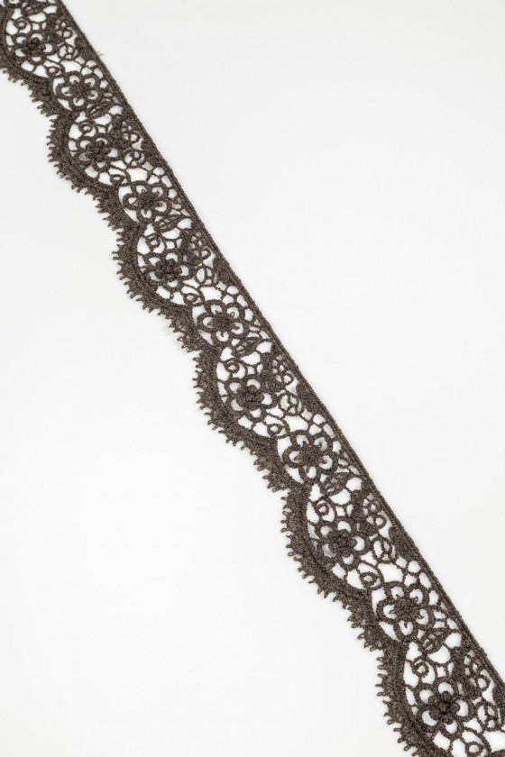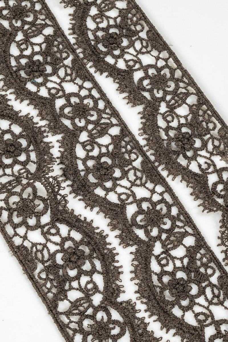 Włoska taśma pasmanteryjna w kolorze ziemistym z nitką lureksową. Motyw kwiatowy, jednostronnie wykończona zębem.
