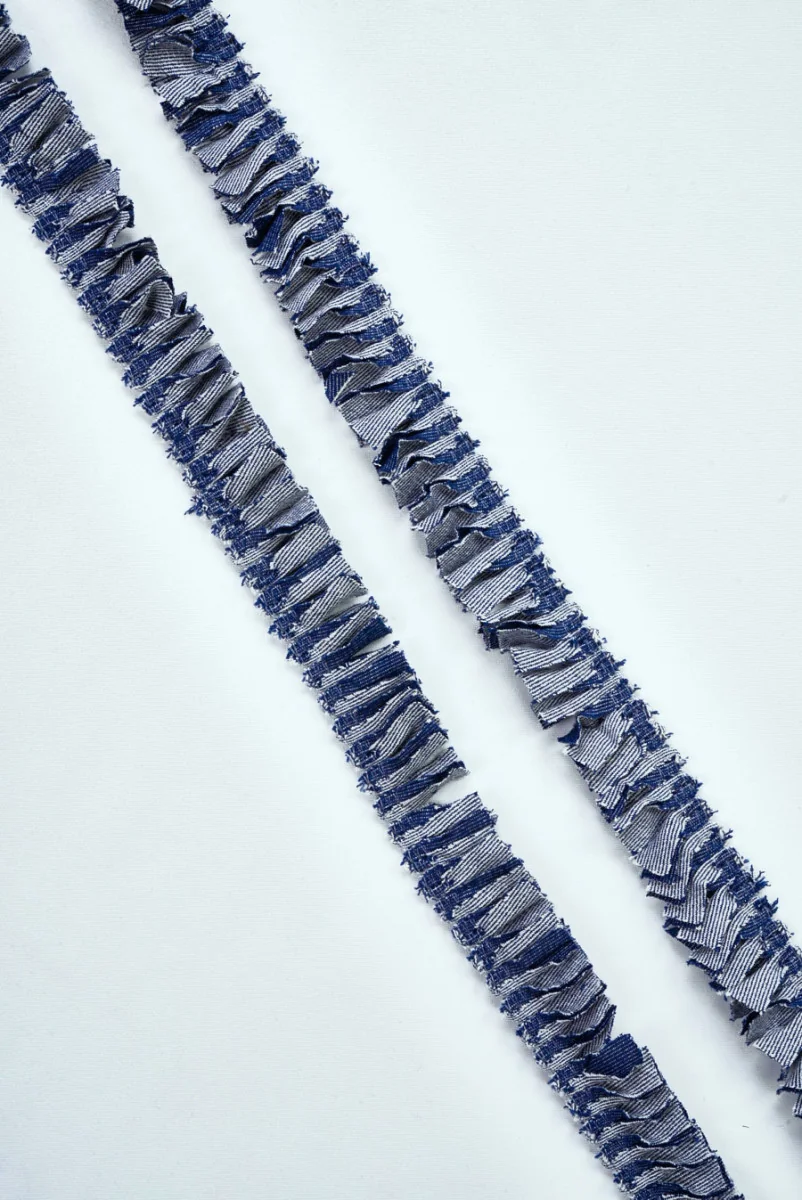 Włoska taśma pasmanteryjna w formie frędzli, wykonana w 100% z bawełny - jeansu. Frędzle są przyszyte naprzemiennie raz na prawej a raz na lewej stronie materiału przez co taśma zyskuje efekt cieniowania. Idealna do wykończenia tkanin jeansowych.